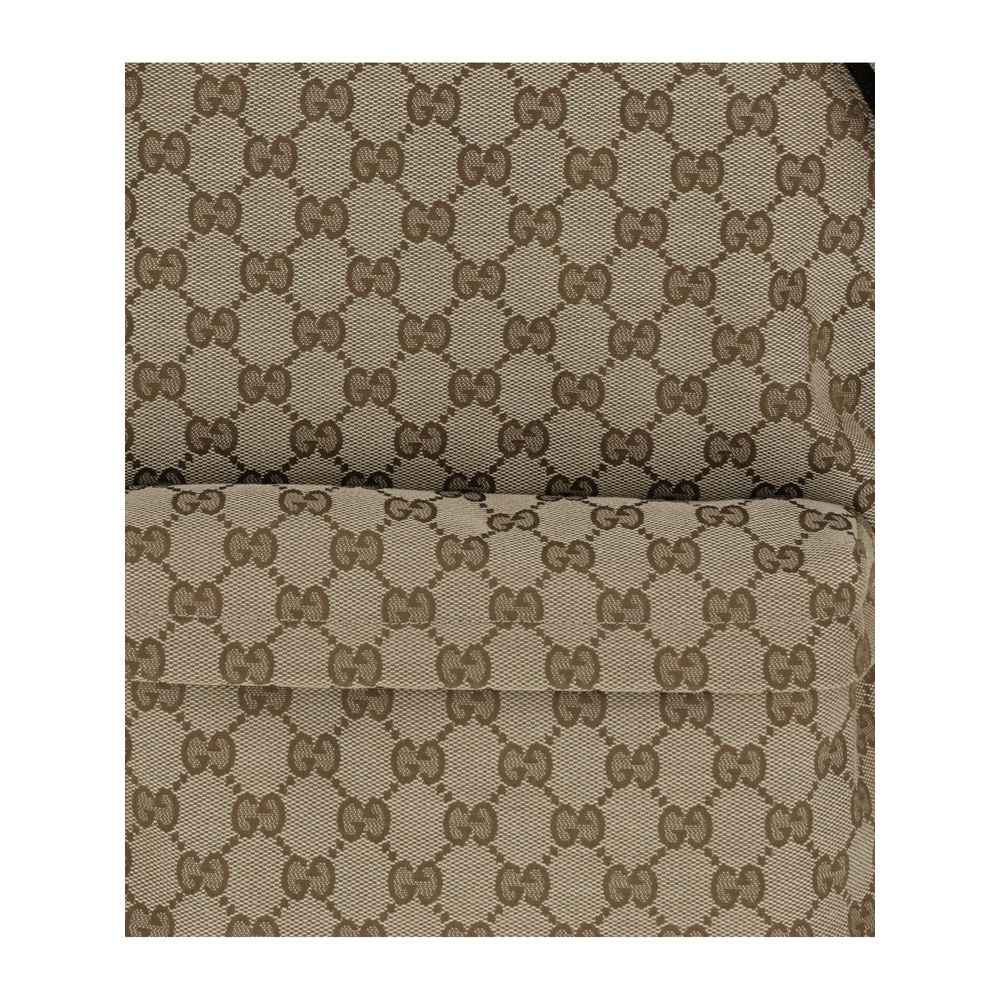 The GG Fabric Backpack by Gucci, from the Spring Summer 2025 Collection, combines craftsmanship and functionality in an elegant design. Crafted in beige and dark brown GG fabric with leather trims and a cotton-linen lining, it features a practical front zip pocket, a padded laptop compartment, and a pen holder. The Web stripe ring detail and embossed Gucci logo complete an accessory designed for both style and everyday use.