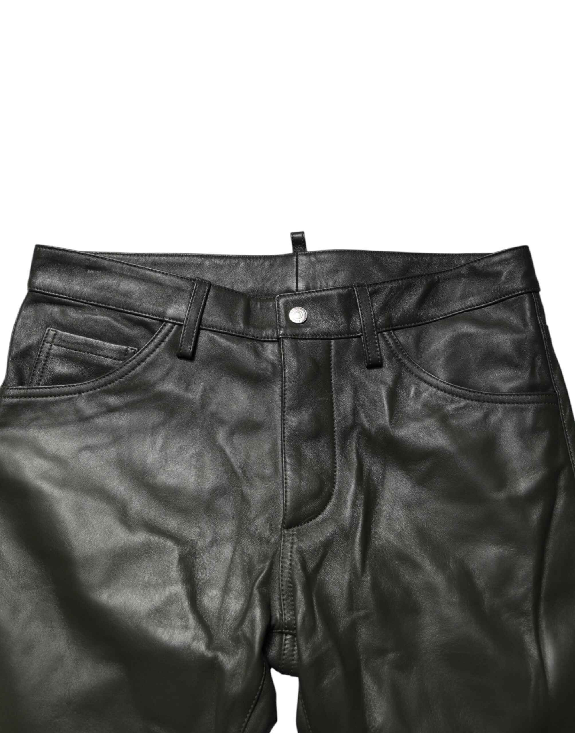 black leather pants. Crafted from premium full-grain leather, they offer a luxurious texture and durable structure. The mid-waist fit and sleek silhouette give them a modern edge, perfect for elevating evening looks or adding a touch of rock-chic style to everyday outfits. Ideal for fashion-forward wardrobes seeking standout sophistication.