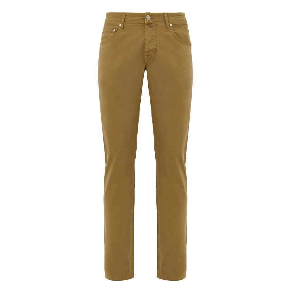In ochre stretch cotton, five pockets, button and covered button closure, slim fit, tone-on-tone J embroidery on the pocket. A ponyskin tag with printed logo is featured on the back. Sold with a cotton bandana and scented with the exclusive Jacob Cohen fragrance.