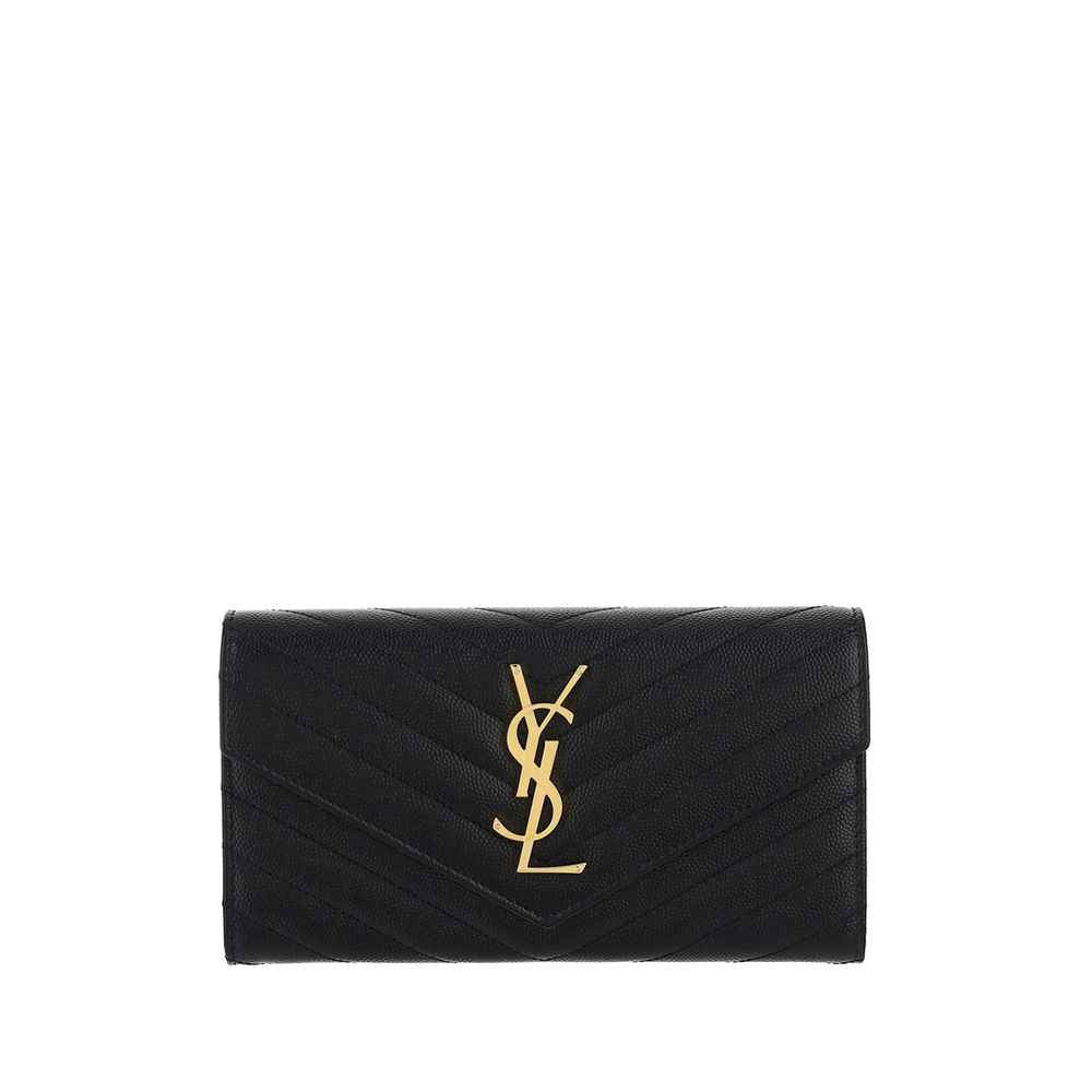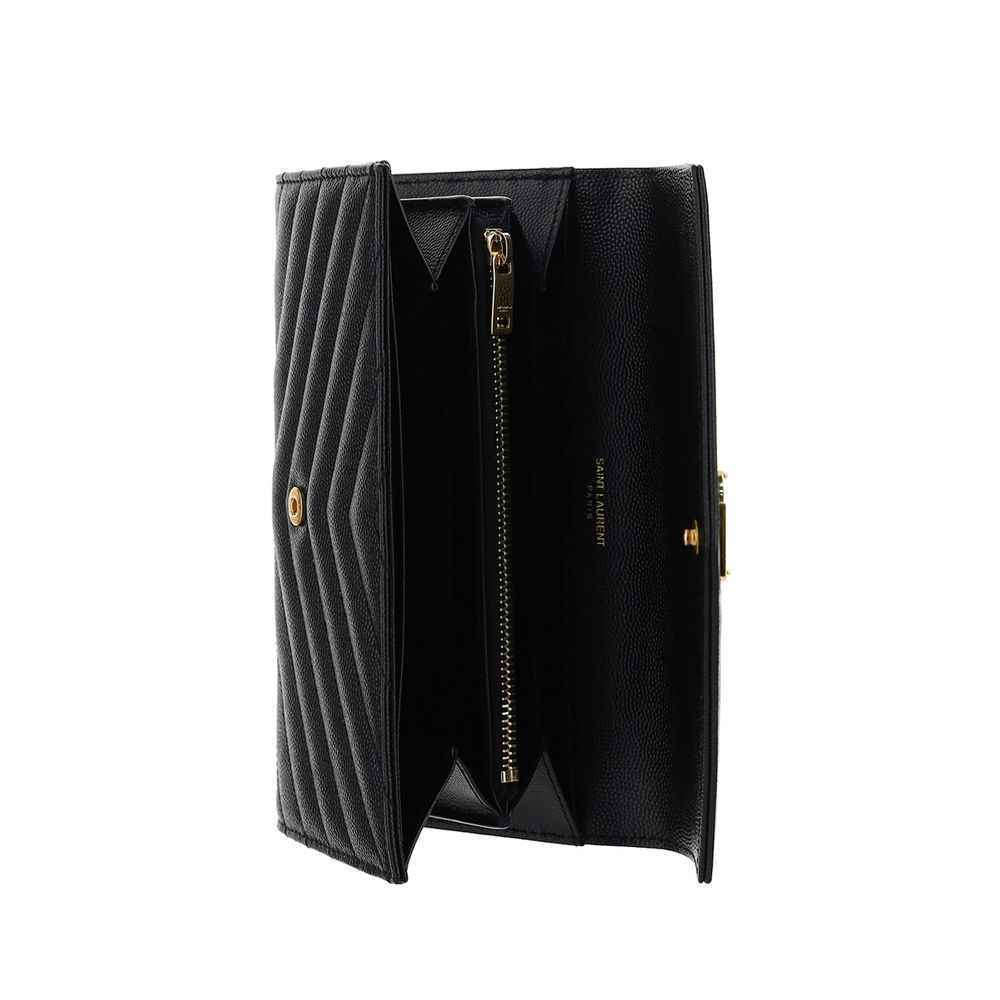 Leather Matellassè Wallet by Saint Laurent, gold brand logo on front, button closure on front, two compartments with one zip pocket, slots card, gold brand logo inside.