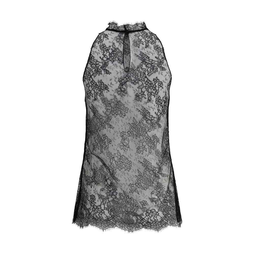 The Sleeveless Alexander McQueen top in black Lace features a button closure at the back of the neck and a stand-up collar. Its elegant and refined design makes it perfect for sophisticated and contemporary looks