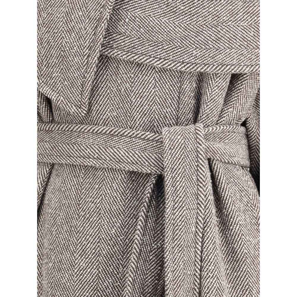 The oversized asymmetric Coat by Ferragamo embodies generous proportions and a soft chevron-textured bouclé fabric, offering a refined yet cozy allure. The couture-inspired cuts and fluid lines highlight the brand’s masterful tailoring, while kimono-style sleeves and a concealed closure add sophistication and ease. A voluminous integrated scarf drapes elegantly across the back and falls along the left side, creating graceful movement and an effortless sense of modern elegance.