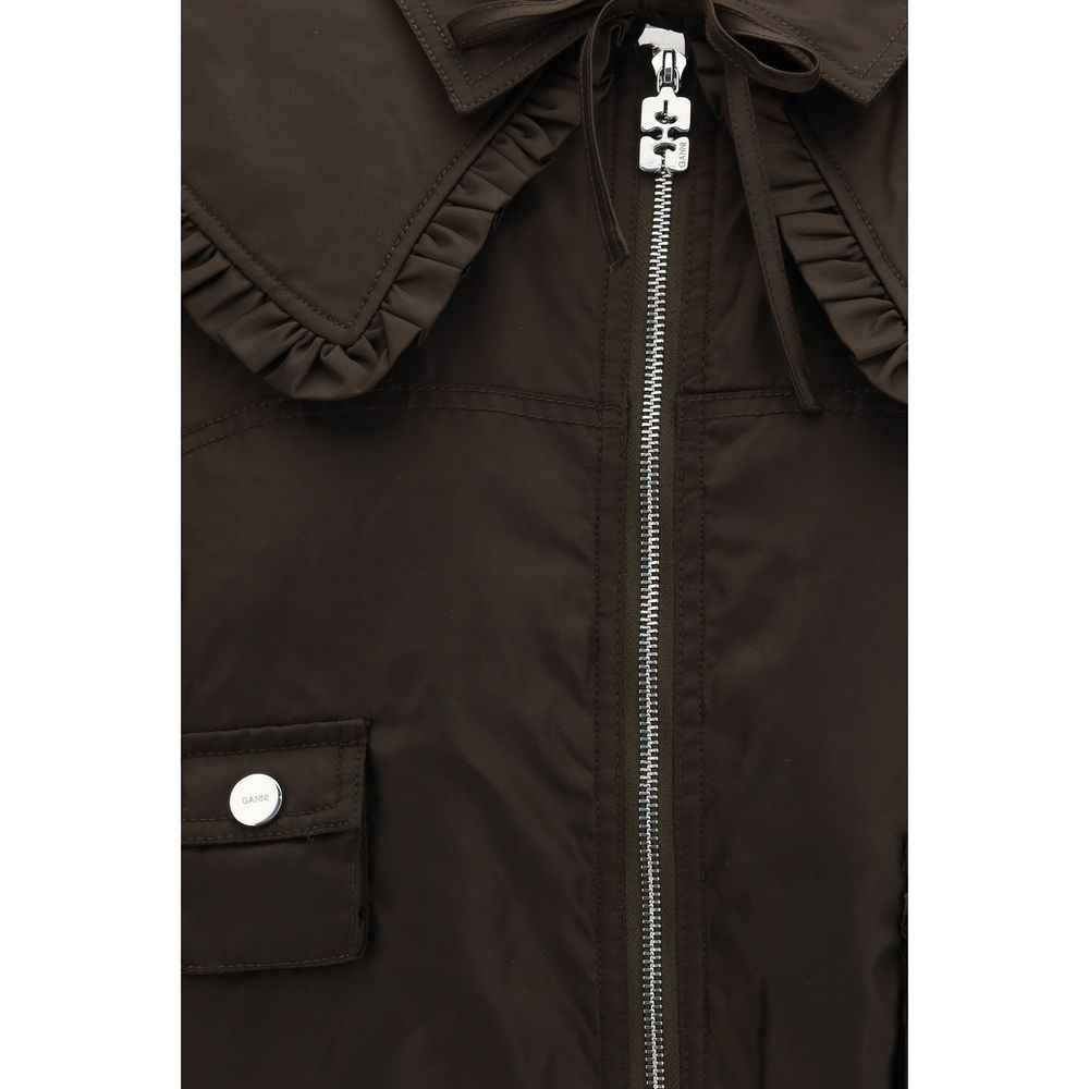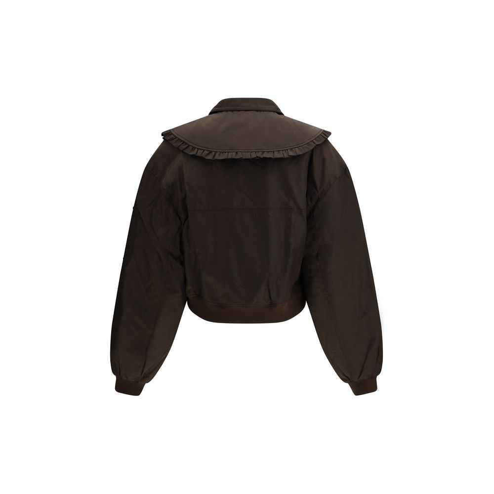 The Duchesse Nylon Bomber Jacket by GANNI offers a fresh, feminine take on a timeless bomber silhouette, infused with effortless Scandinavian cool. Crafted from recycled nylon, this jacket features a relaxed, slightly cropped fit that feels modern and easy to wear. A detachable collar with delicate ruffled edges adds a soft, unexpected detail, elevating the classic utility-inspired design. Finished with a full-length zip closure, wide long sleeves, ribbed trims and multiple practical pockets, this bomber strikes a perfect balance between function and style. A contemporary wardrobe staple designed for everyday urban dressing.