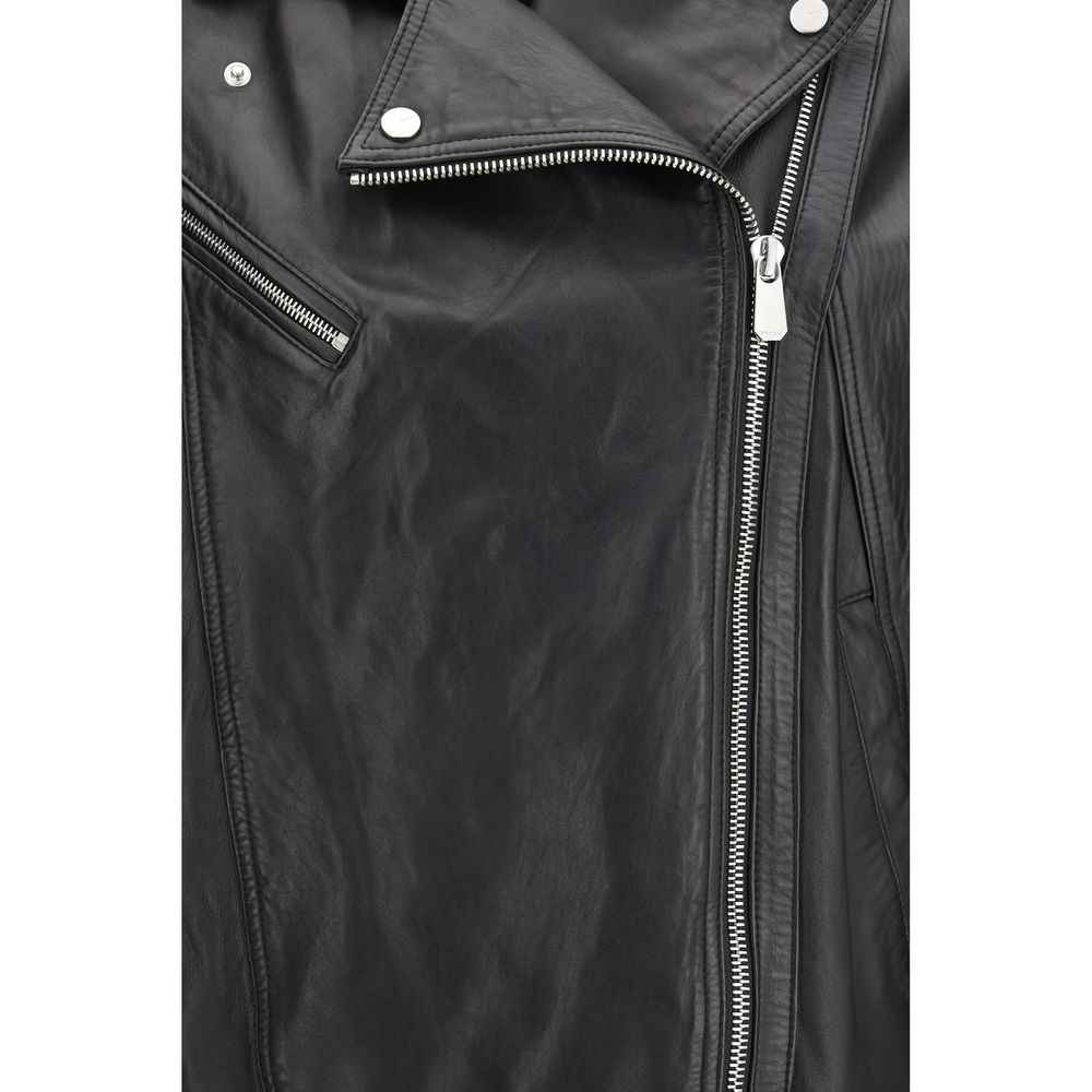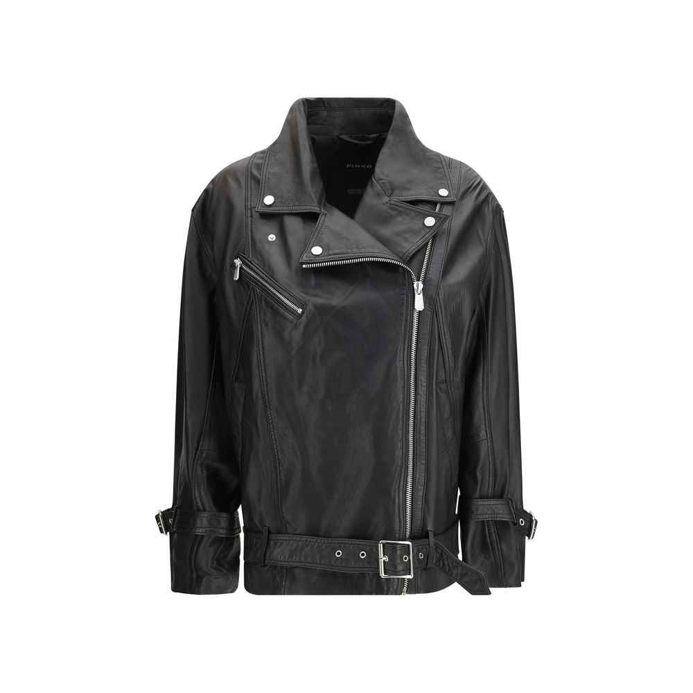 The leather biker Jacket by Pinko offers a contemporary reinterpretation of the classic biker style with a bold, modern attitude. Designed with a shirt-style collar and an off-centre zip fastening, it features slanted pockets and a flap pocket with snap button for added functionality. Adjustable cuffs and a buckle belt at the hem allow the fit to be customised, whether worn open or closed. Crafted from leather with an attractive aged effect achieved through a special dyeing and finishing process, this jacket has a slightly softer, less structured silhouette, perfect for elevating everyday looks with statement style.