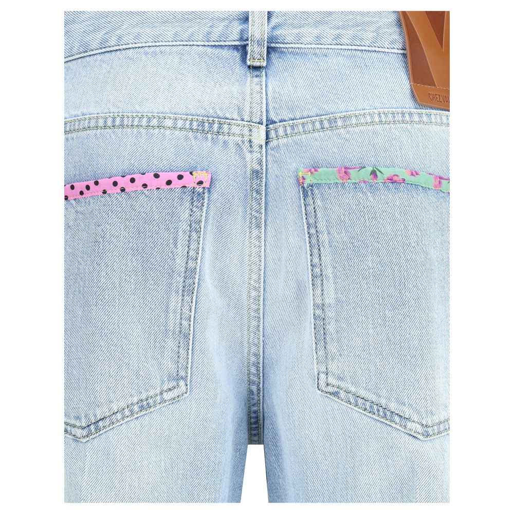 The Valentino Floral edge Jeans combine the classic five-pocket straight cut with refined and original details. The front zip and button fastening, belt loops and polka dots on the pockets add practicality and style, while the edges decorated with floral motifs give a romantic and distinctive touch.