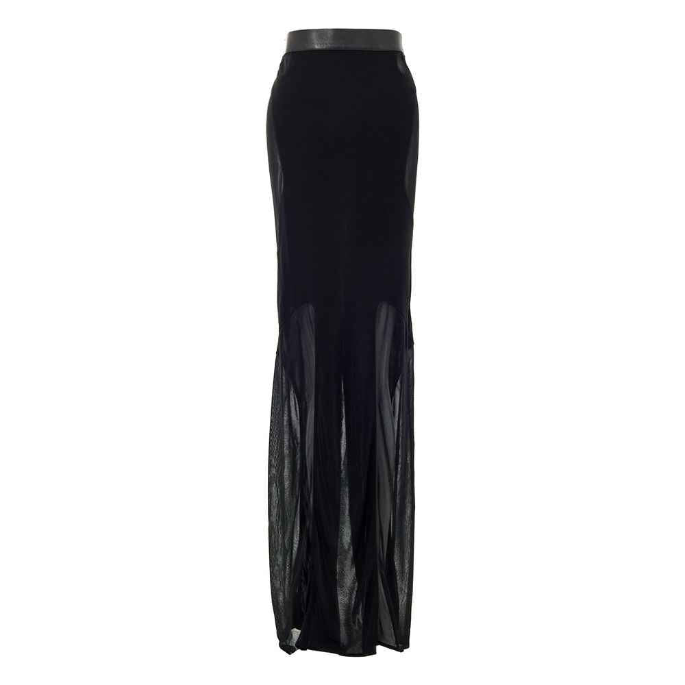 Tom Ford Black Sheer Viscose Long Skirt. Organza-effect fabric with sheer details, black leather waistband, covered back zip closure, maxi back slit, straight fit.