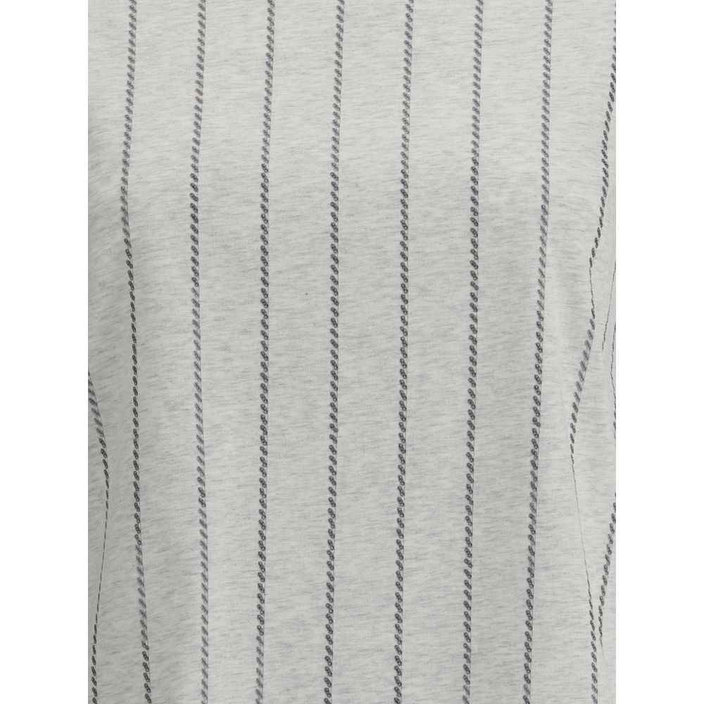 Brunello Cucinelli’s striped T-Shirt with mini sequins is a garment with a discreet and luminous appeal. Made in a delicate gray mélange shade, it is embellished with subtle stripes embellished with micropaillettes, which lend a touch of refined elegance to an essential design.