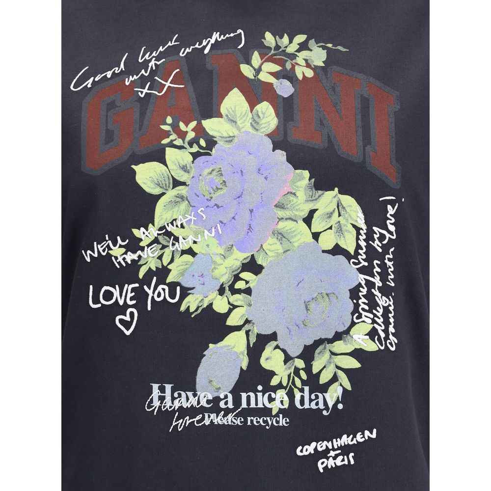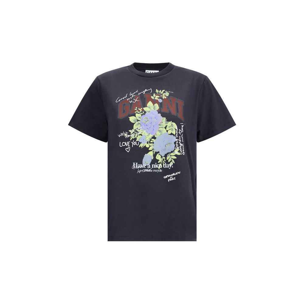 Ganni’s Rose T-Shirt is a fresh and graphic style garment with a round neckline, short sleeves and GANNI logo. The rose print accompanied by the words “Have a nice day! Please recycle!” adds a romantic touch and a message of sustainability.