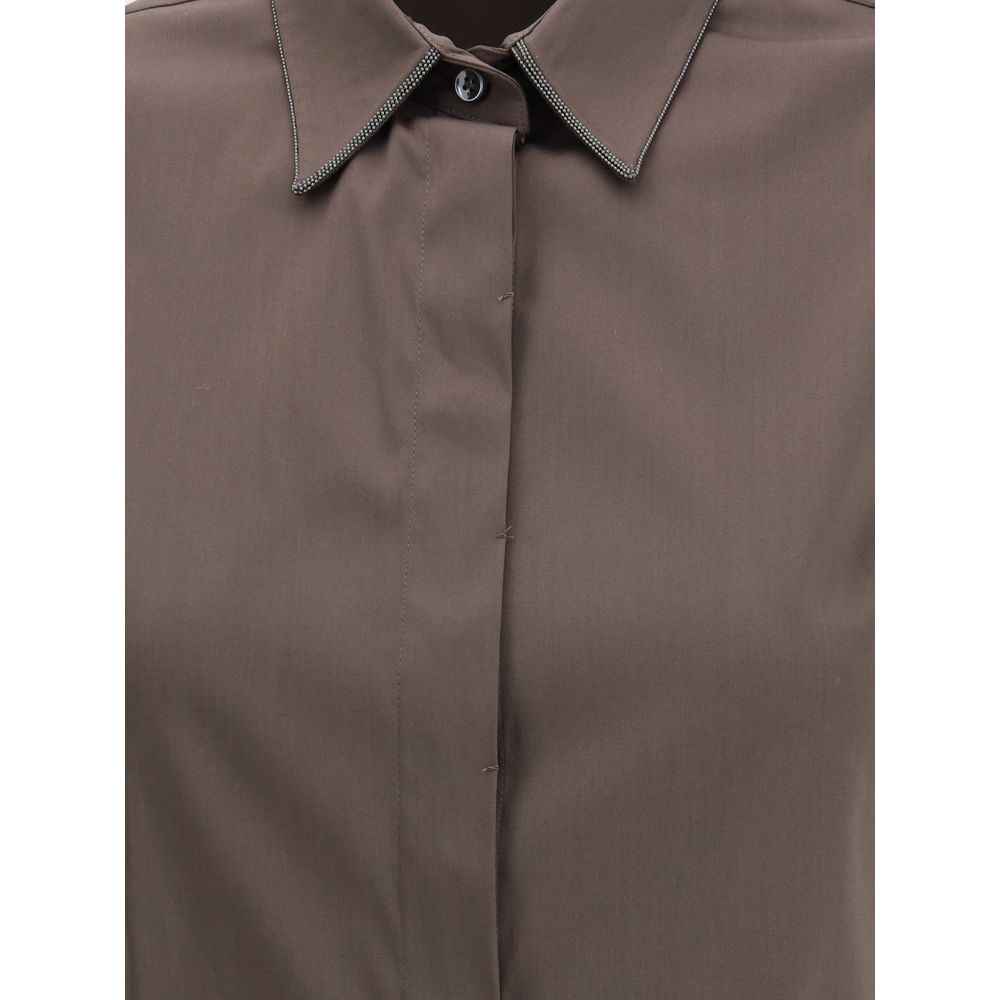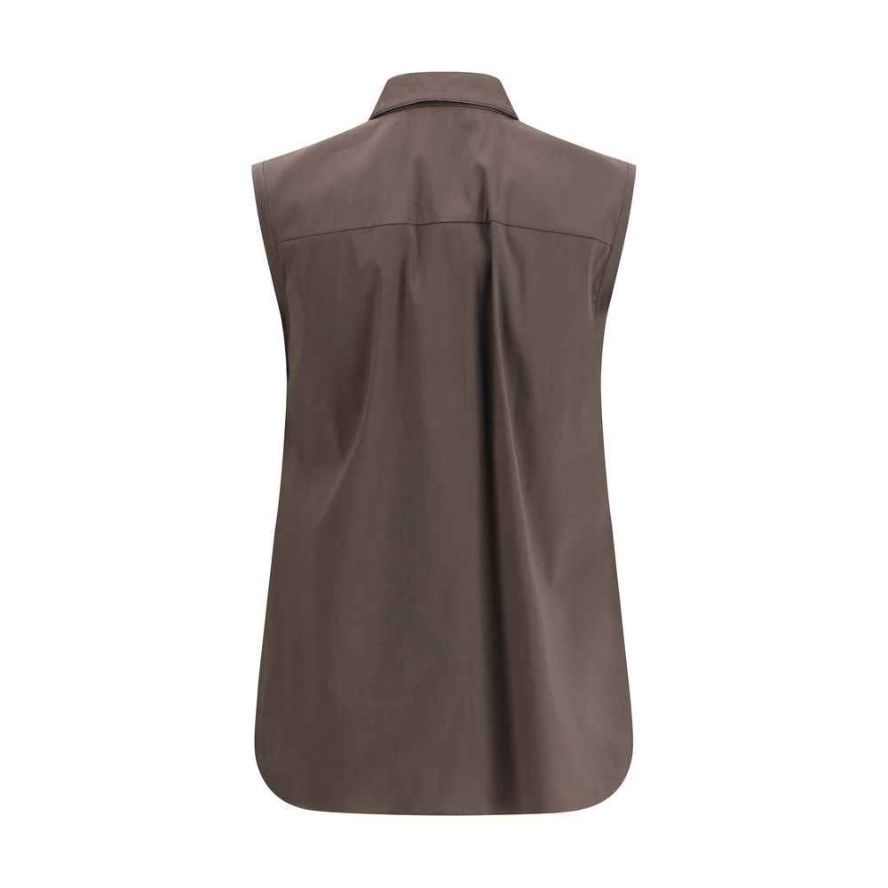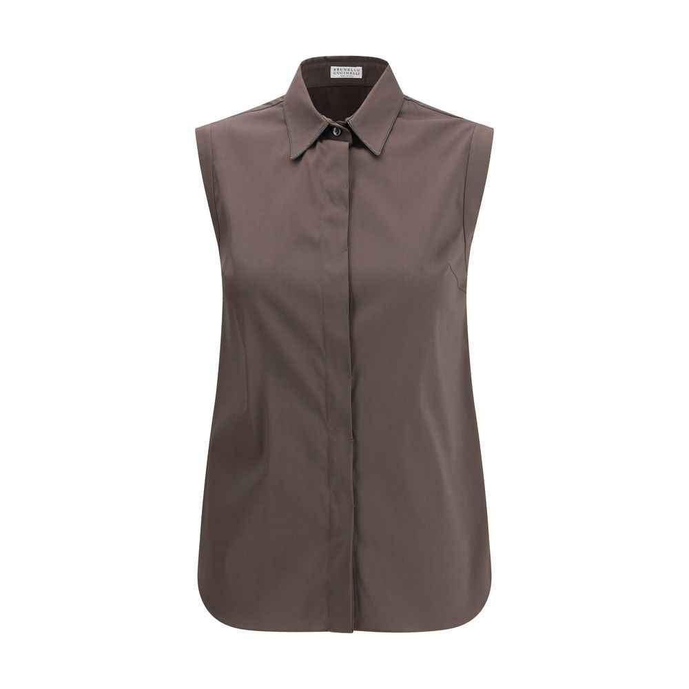 This sleeveless Shirt by Brunello Cucinelli embodies the brand’s signature understated elegance. Crafted from pure cotton, it features a classic collar adorned with delicate monile embellishments that lend a subtle, refined sparkle. The concealed front button closure ensures a clean, minimalist silhouette, while the regular fit provides both comfort and balance. A timeless and feminine piece, perfect for sophisticated yet modern styling.