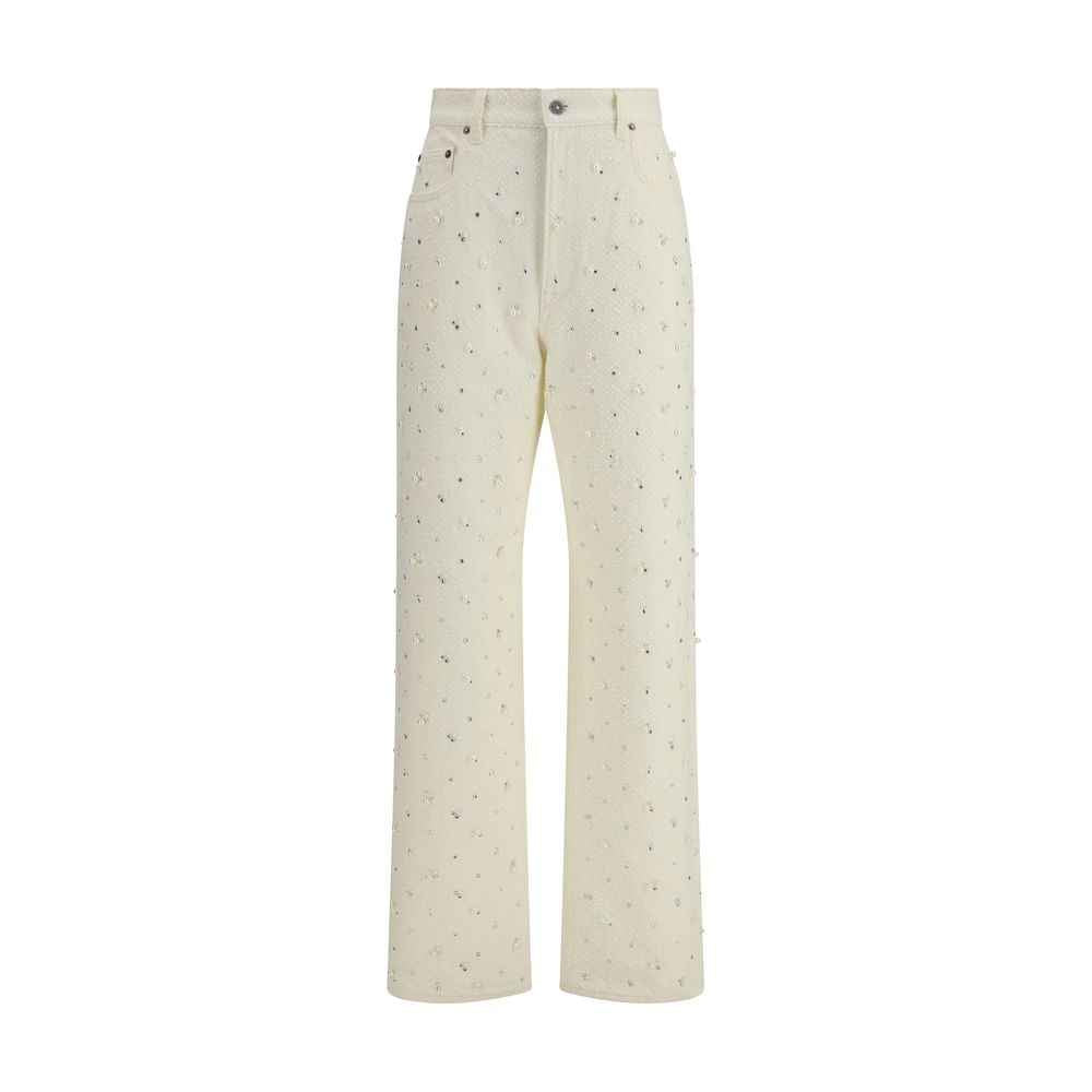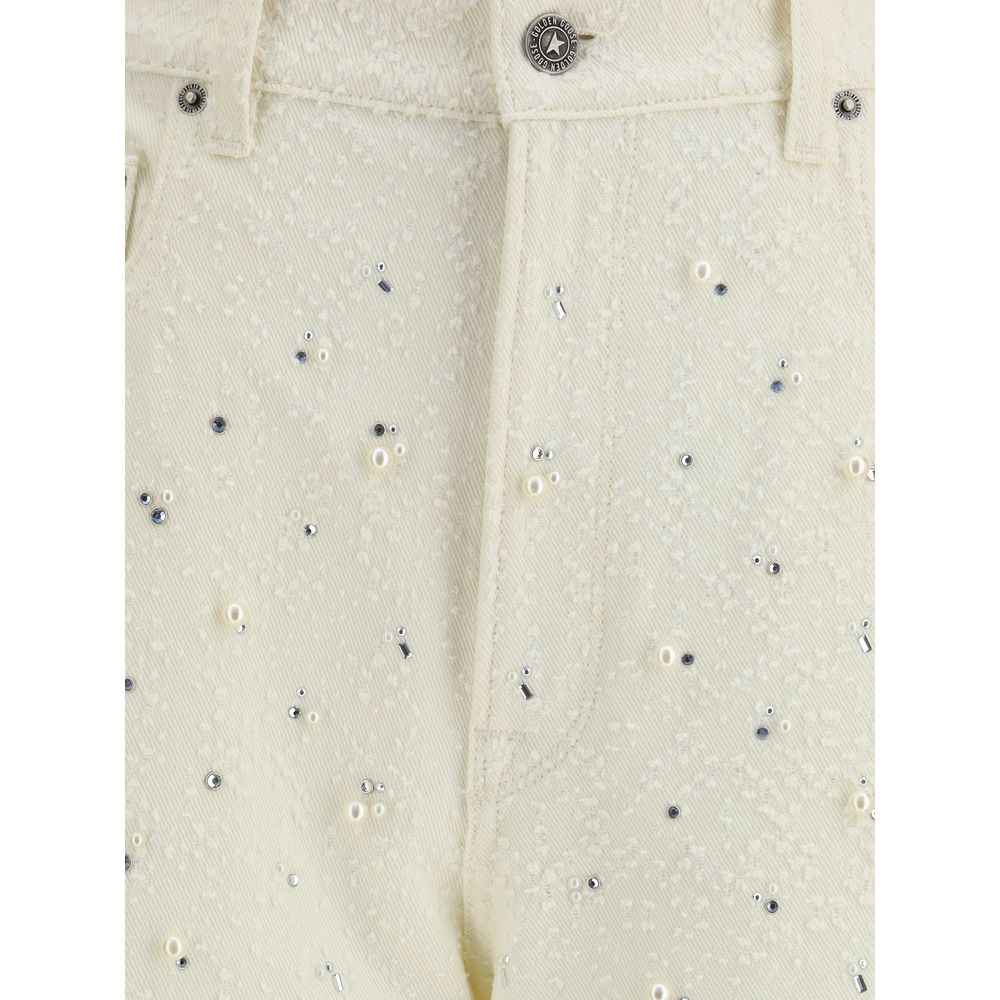 The white denim pearl and crystal embroidered Pants by Golden Goose channel the funky glamour of the 1970s, an era where the night became a canvas for self-expression. Crafted from lived-in effect bull denim, these straight-leg pants are embellished all over with pearls and crystals for a luminous, statement look. The design is completed with two back pockets, a classic five-pocket construction, and the brand’s signature silver star details on the back. A retro-inspired piece infused with modern Golden Goose attitude.