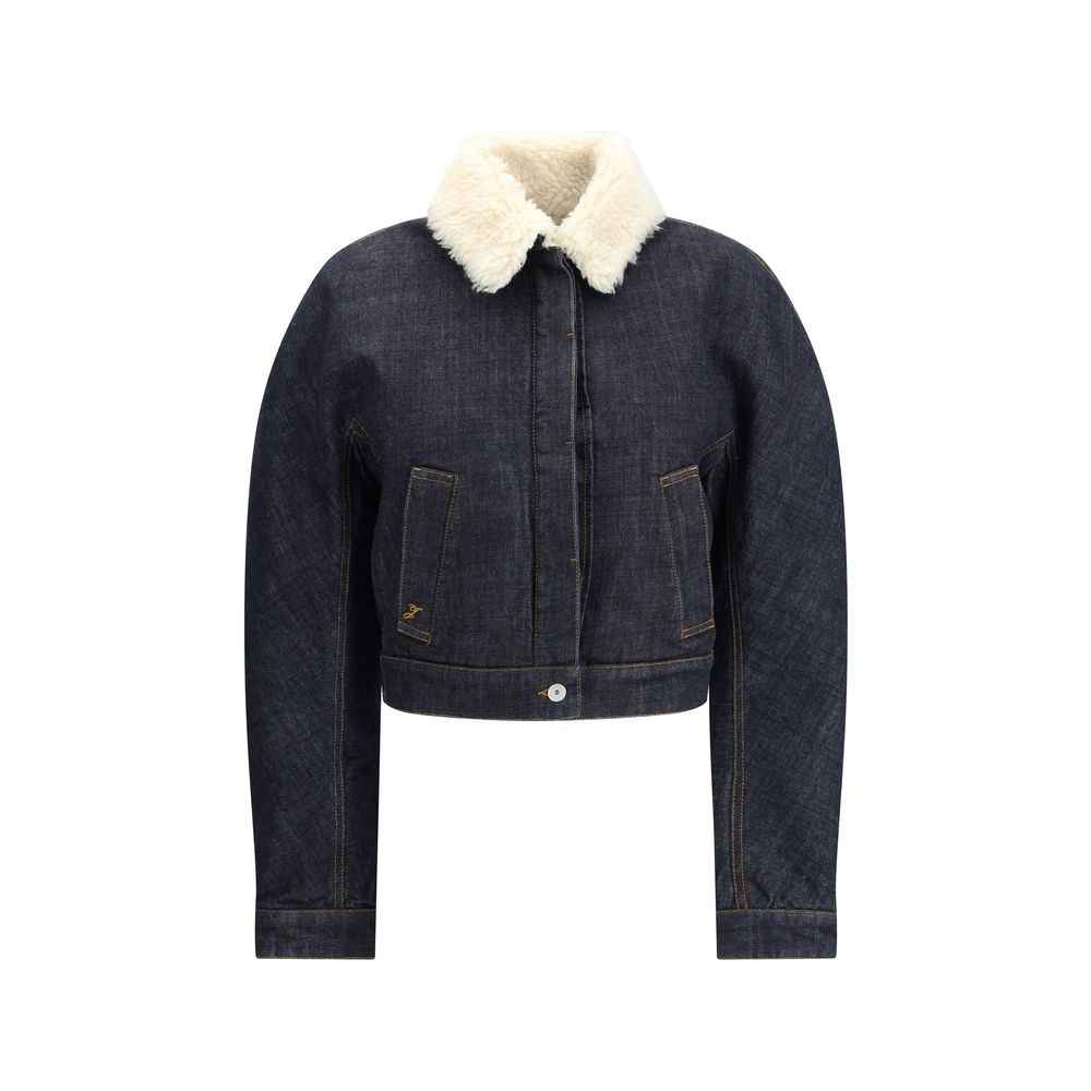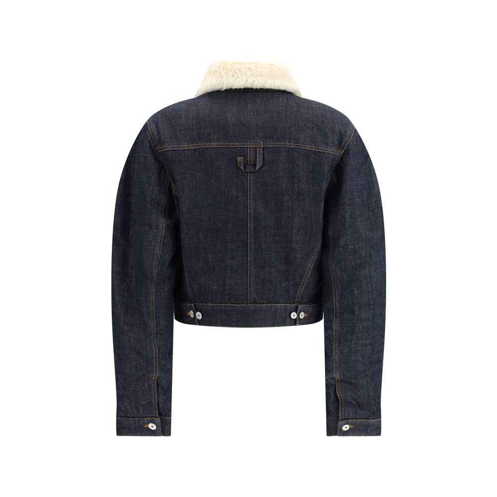 The De-Nîmes Ovalo Denim Bomber by Jacquemus reimagines the classic aviator silhouette with a contemporary and artisanal touch. Crafted from rinsed raw indigo denim, it features contrasting stitching and a pointed faux-shearling collar for added texture and warmth. Rounded sleeves and a concealed button closure lend a relaxed sophistication, while welt pockets embroidered with the signature “J” and a matching back loop highlight the brand’s refined detailing. Fully lined in faux shearling with engraved metal buttons and adjustable tabs at the hem, the jacket offers a straight fit that perfectly balances comfort and modern style.