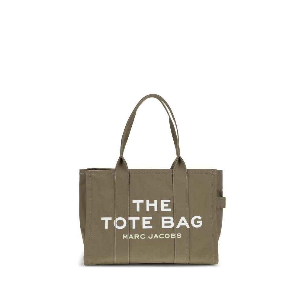 The cotton The Large Tote Handbag by Marc Jacobs, two rigid tubular top handles, top zipper closure, single interior pocket, adjustable and removable flat shoulder strap, contrasting jacquard print iconic brand monogram on front, contrasting patch with iconic brand monogram applied on back.
