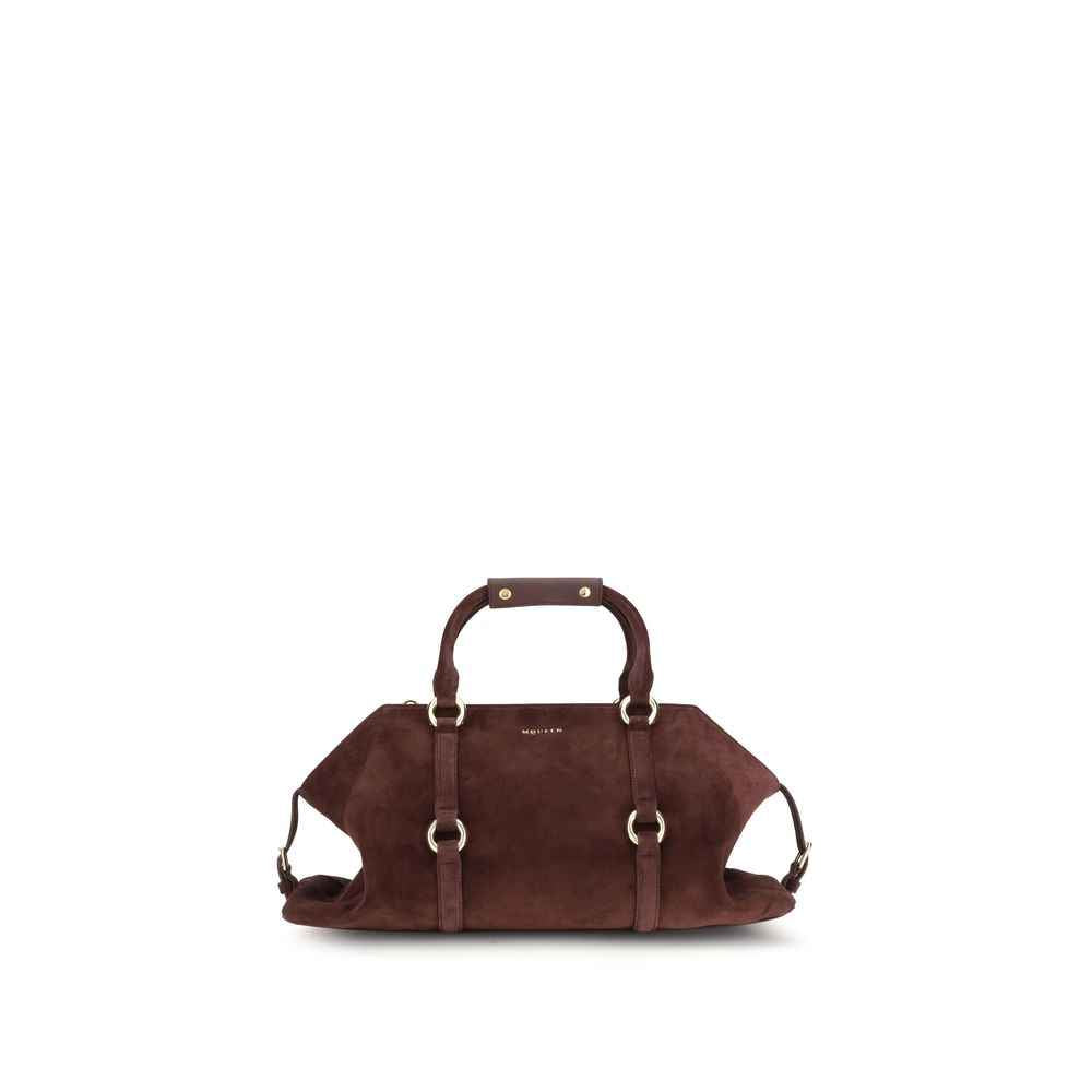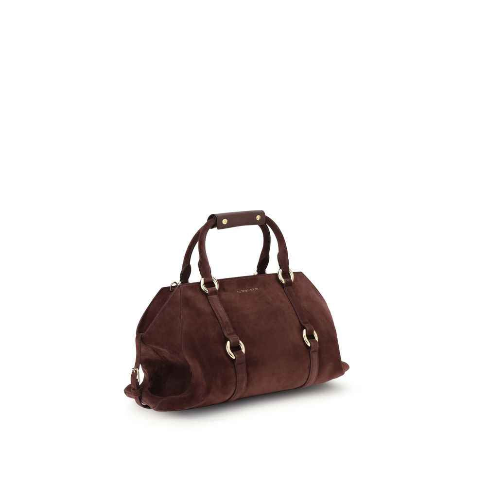 The Farringdon Bag by McQueen is named after the historic location of McQueen’s design studio and atelier. Its elongated silhouette in suede leather is accented with gold-tone metal details and a leather belt inspired by McQueen’s iconic Harness belts. Side buckle straps allow for adjustable capacity, and the bag can be carried by hand using the tubular handles or worn over the shoulder with the removable leather strap.