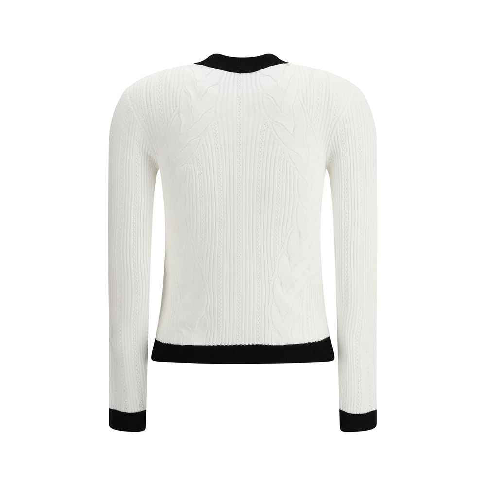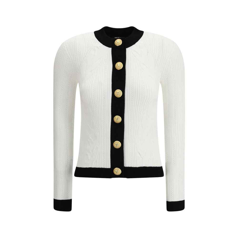 Balmain’s Contrast Trim Cardigan features a ribbed and braided design enhanced by a silhouette-defining ribbed crew neck and hem. The front closure is embellished with embossed gold buttons, an iconic detail that adds a touch of luxury and sophistication to the garment.