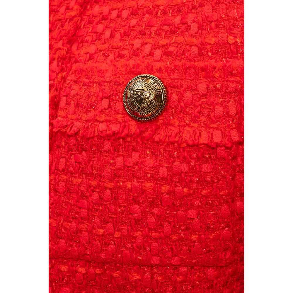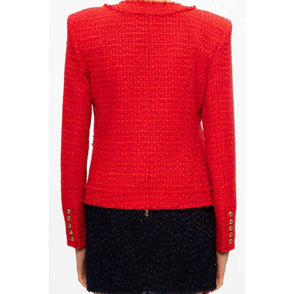 Balmain wool-viscose blend short jacket with raw-cut collar and hem, four front pockets with gold button, hook-and-eye closure, buttons on cuffs