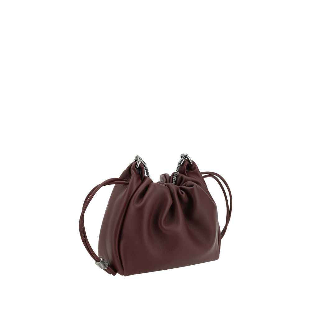 Brunello Cucinelli’s Bucket Mellow Mini leather Shoulder Bag is a sophisticated and distinctive accessory. The shoulder strap, composed of four strands of iconic shiny jewelry, adds a touch of luxury and uniqueness to the design. The top drawstring closure offers practicality and security, while the iconic monogram printed on the front gives an exclusive detail. Inside, the bag features a single compartment, ideal for storing essentials.