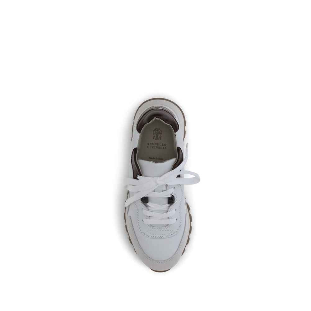 The leather Sneakers with shiny details by Brunello Cucinelli combine artisanal elegance and luminous details. Crafted from smooth leather, they feature flat cotton laces and a fabric lining for comfort and breathability. The removable insole and lightweight microsole offer a comfortable fit, with a 2 cm heel at the highest point. The distinctive touch is provided by the shiny jewel decoration, which adds sparkle and refinement to the minimalist design.