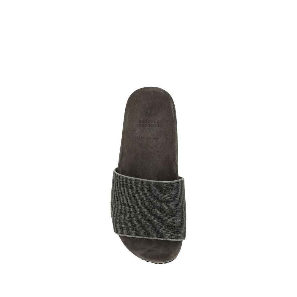 Sandals by Brunello Cucinelli, flat sole, round toe, wide band on the front covered with the brand’s iconic jewels, suede sole design, press-stamped logo insole.