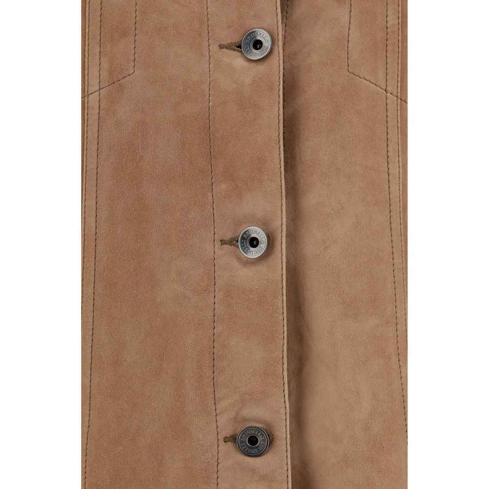 The leather Jacket by Brunello Cucinelli is a piece that combines elegance and versatility, perfect for those seeking a sophisticated yet timeless style. The suede design gives the piece a soft and refined texture, while the classic collar adds a touch of elegance. The front button closure maintains a clean and understated look, while the two welt pockets with flap and button on the front offer a functional yet chic detail. The side slit pockets complete the design, adding further practicality and style.
