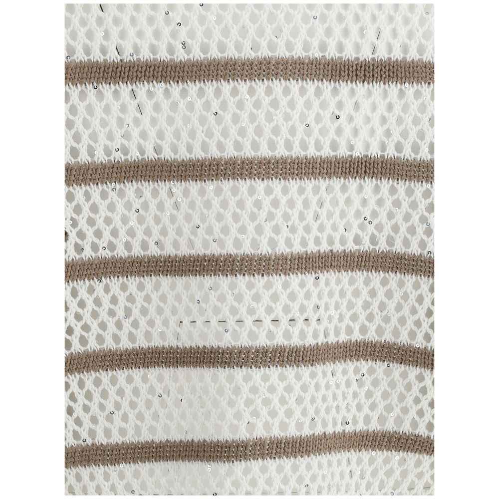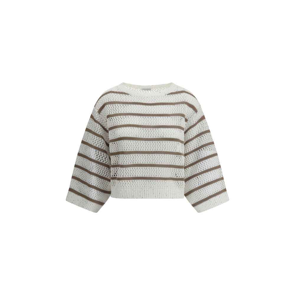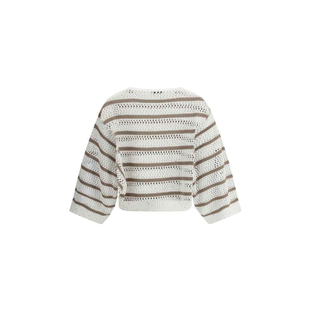 The linen Sweater by Brunello Cucinelli is an elegant and sophisticated piece, featuring a ribbed crew neck that adds a touch of refined simplicity. The openwork knit design with all-over shiny sequin details adds brightness and a touch of glamour. The wide three-quarter sleeves create a soft and fluid effect, while the ribbed cuffs and hem ensure a comfortable and well-defined fit. The loose fit gives the sweater a relaxed yet elegant look, making it ideal for sophisticated yet comfortable looks.