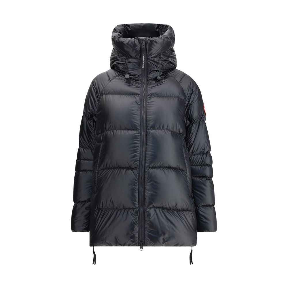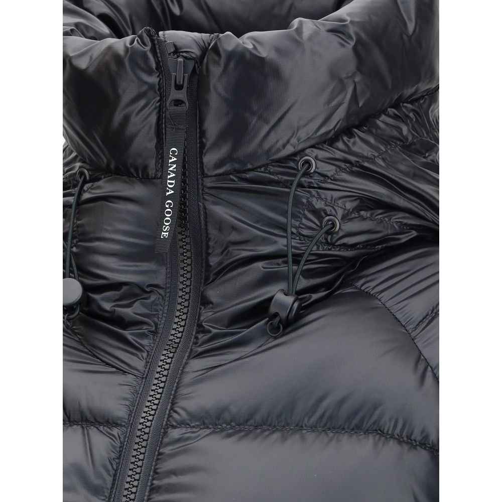Cypress Jacket by Canada Goose, padded and quilted design, adjustable drawstring hood, front zipper closure, contrasting brand signature appliqué on puller, iconic brand monogram patch appliqué on arm, two zippered welt pockets on front, zippered side slits.