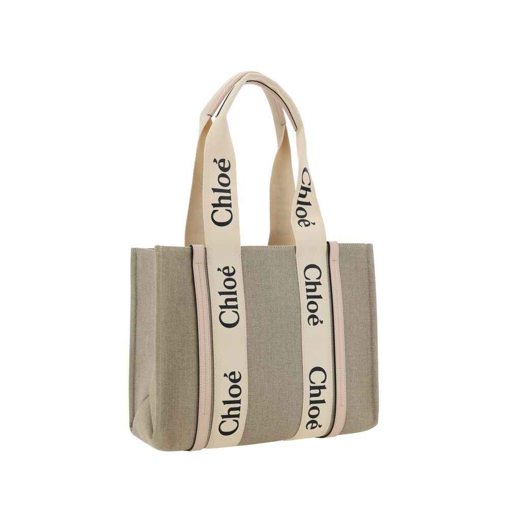 Canvas Woody Shoulder Bag by Chloé, two flat top handles, removable and adjustable flat leather shoulder strap, bands on front and back with contrasting iconic brand monogram, interior flat pocket, leather trim.