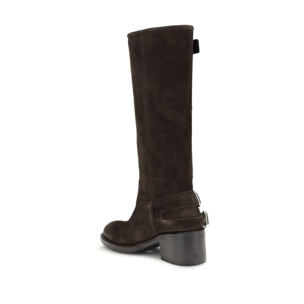 The Dakota Boots by Chloé are crafted from suede leather and inspired by the classic biker style. The sturdy rubber sole combines a tubular shaft with a comfortable stacked heel, while multiple silver-toned Paddington buckles complete these knee-high boots with a bold touch.