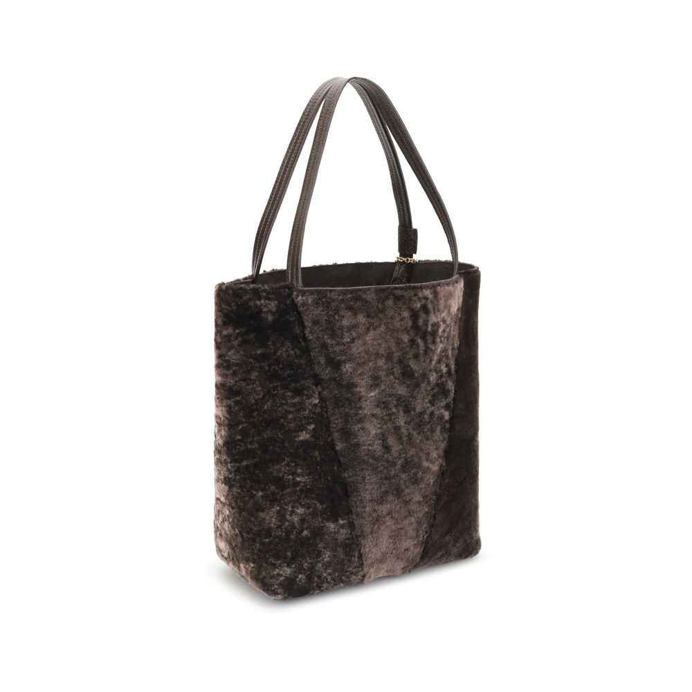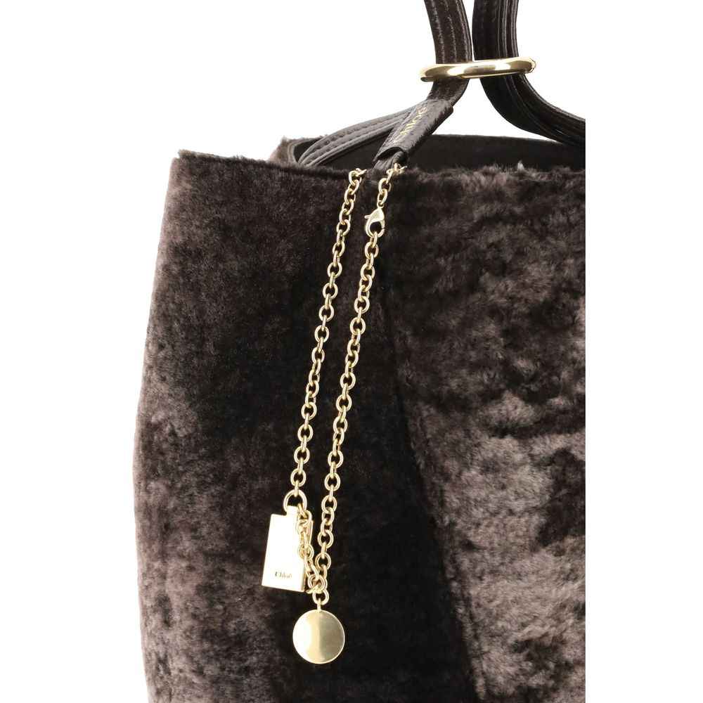 The Spin Shearling Tote Bag by Chloé is a dark brown shearling tote accented with gold-tone hardware. It features double handles and a decorative chain with Chloé and Horse pendants. The tone-on-tone interior completes the refined design. It can be worn over the shoulder or carried by hand by slipping the handles inside the ring for convenience.