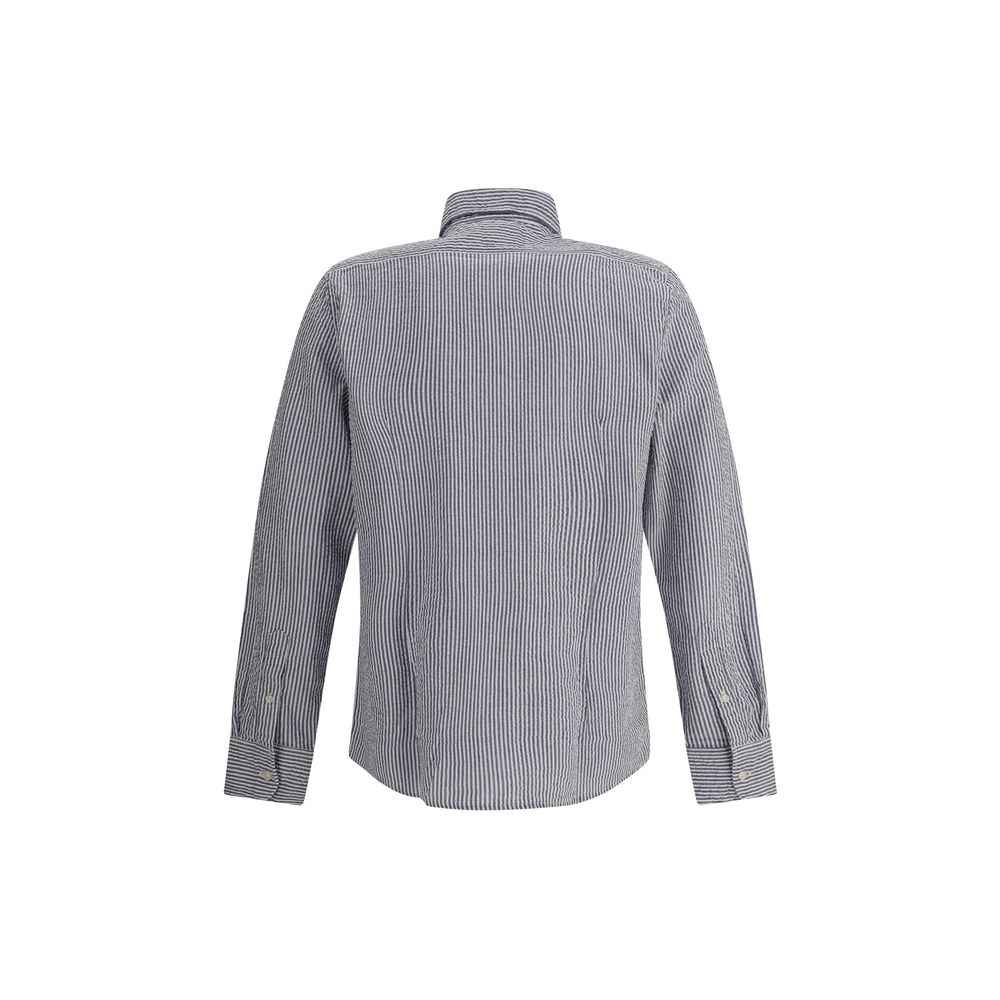 Cotton Seersucker Shirt by Deperlu, classic collar, front button closure, elastic fabric, all-over repeated stripe pattern, regular fit.
