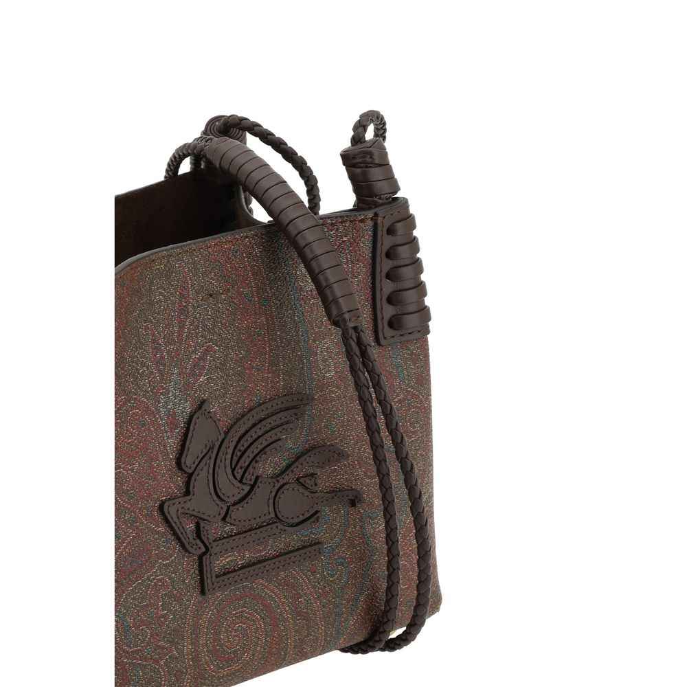 Etro’s Shoulder Bag is an elegant and functional accessory featuring the iconic paisley pattern, which covers the entire surface of the bag, giving it a distinctive and sophisticated look. The two top handles are woven, adding a handcrafted and refined touch. Inside, the bag features a single compartment with a zippered welt pocket for safe and organized storage of smaller items. The closure is secured by snap hooks, offering added convenience. The brand’s iconic Pegasus logo is applied to the front, while metal feet at the base protect the bag from damage and ensure stability.