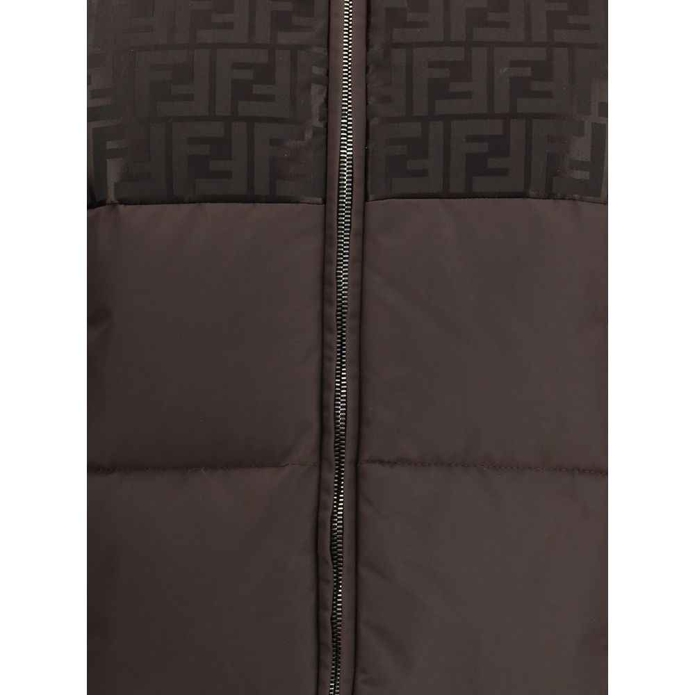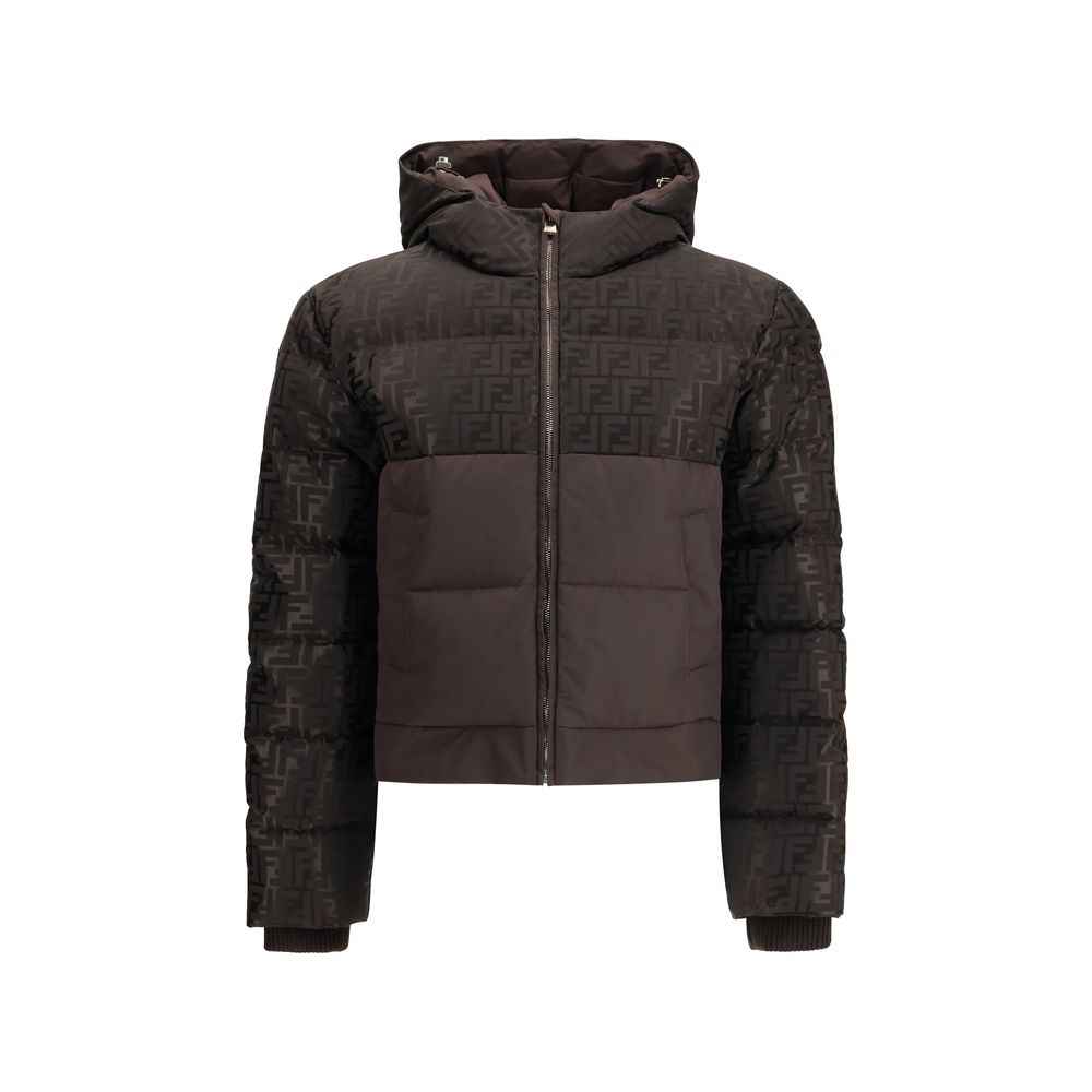 The Padded Technical FF Jacquard Jacket by Fendi features a functional yet refined design with a high collar, adjustable drawstring hood, and front zip fastening. Diagonal pockets and rib-knit cuffs enhance comfort and practicality, while the glossy jacquard nylon with the iconic FF motif defines the jacket’s distinctive character. Lightweight yet structured, it embodies the Maison’s contemporary elegance, blending technical precision and signature style in a perfect balance of luxury and performance.