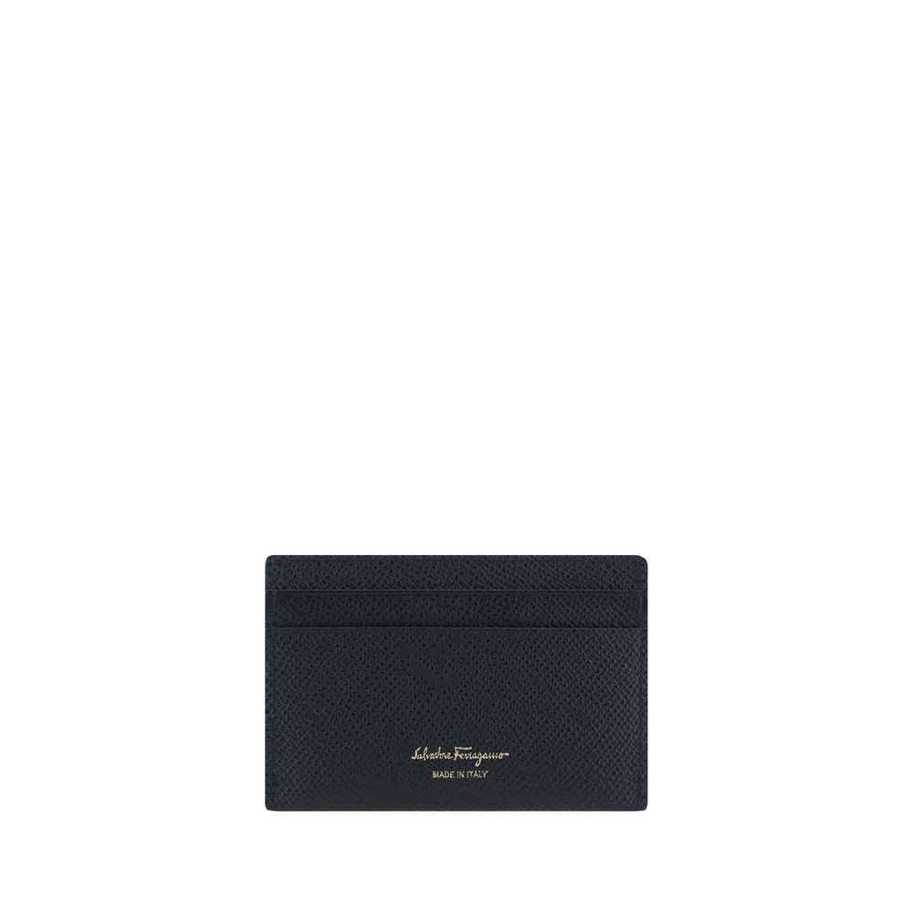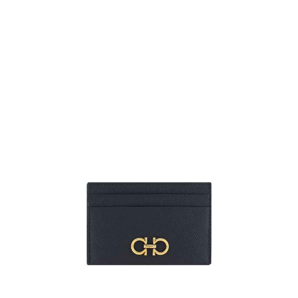 Calfskin Card Holder by Ferragamo, grained leather design, card slot on front, iconic embossed Gancini logo on front, card slot on back, iconic brand signature printed in contrast on back.