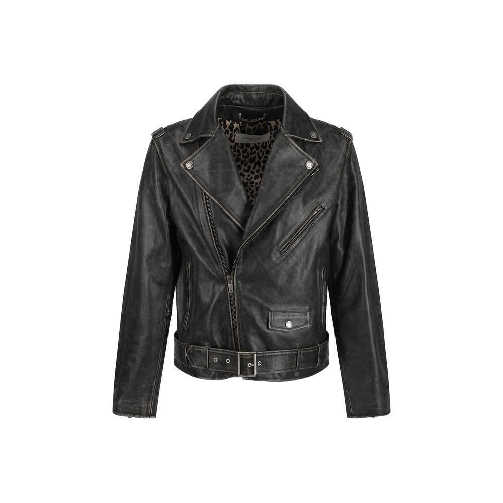 Leather Golden Biker Jacket by Golden Goose, worn vintage effect design, double-breasted front zipper closure, large classic lapels, two vertical welt pockets with zipper for closure, leather waistband adjustable by metal buckle, welt pocket on front, front flap pocket closable by magnetic button, sleeves adjustable by zipper, regular fit.