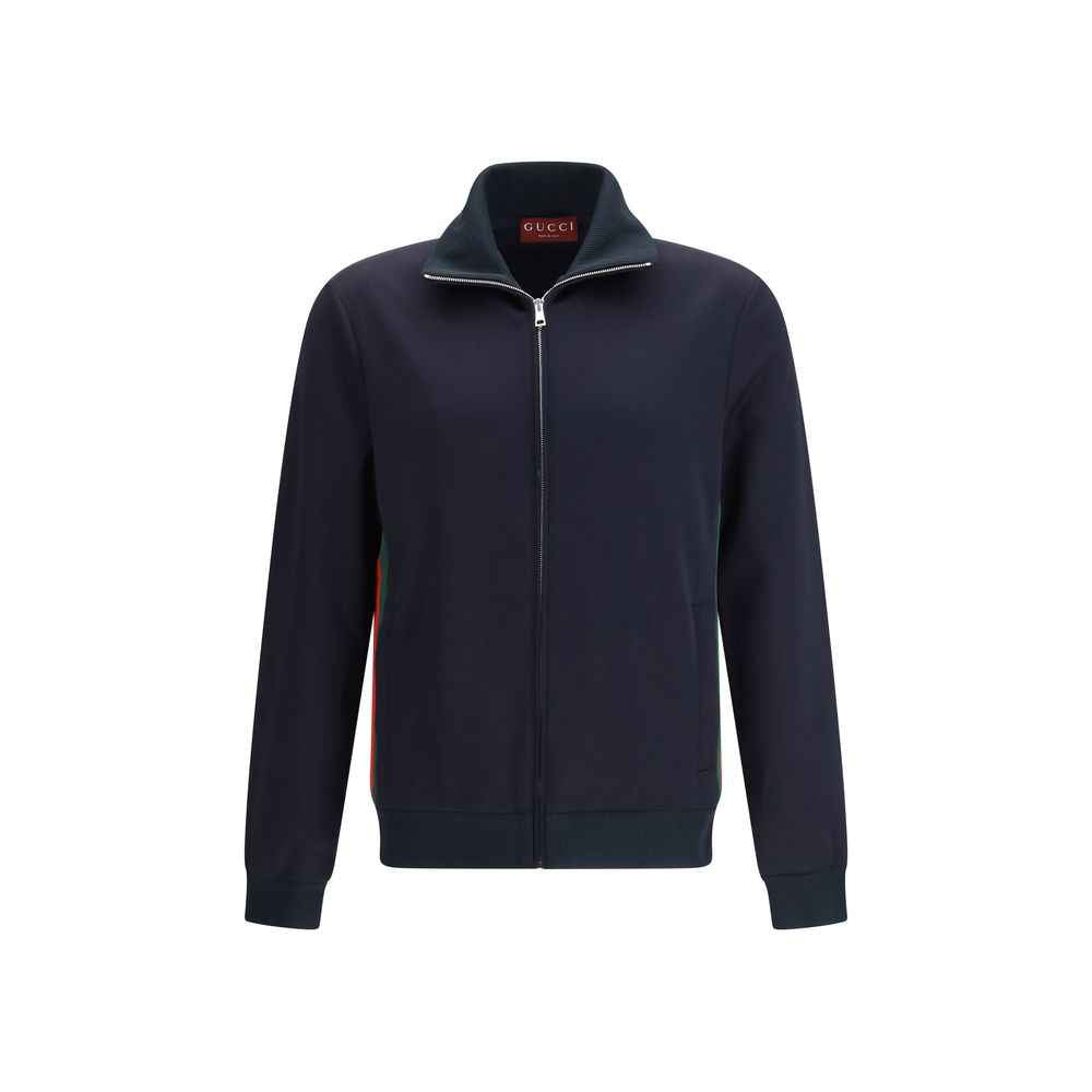 The technical jersey zip-up Jacket by Gucci delivers a refined sporty aesthetic through the Maison’s iconic codes. Crafted from dark blue technical jersey, it features Web tape inserts that define its distinctive design. The stand collar, long sleeves and two front pockets create a clean and functional silhouette, completed by a front zip fastening that signs the piece with Gucci’s unmistakable style.