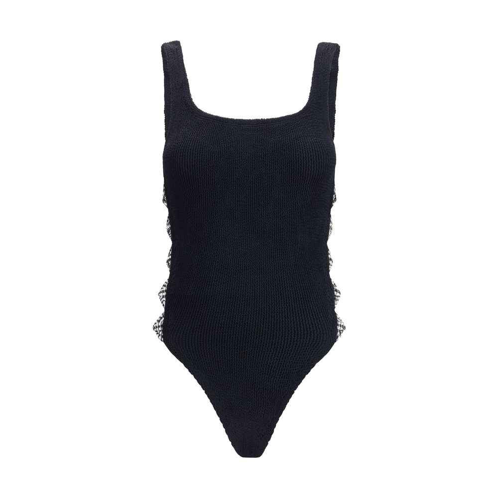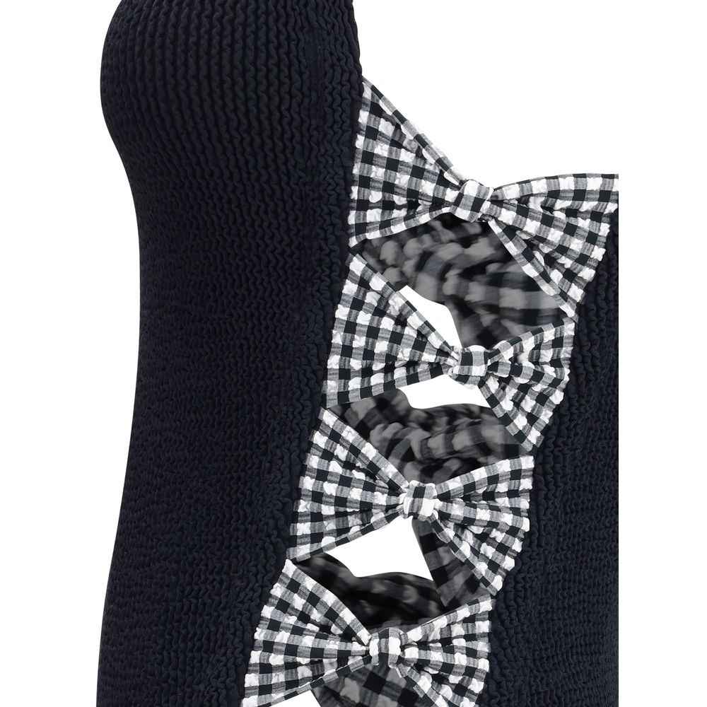 The Tiffany One-Piece Swimsuit by Hunza G combines elegance and comfort in a sporty design with a strong character. Featuring tone-on-tone straps and crossed cut-out details on the side panels, it is enriched by contrasting bows that add a sophisticated and dynamic touch. Made in the exclusive Original Crinkle fabric, it adapts perfectly to every body shape thanks to its ability to stretch, sculpt and support the shapes, ensuring a unique and versatile fit.