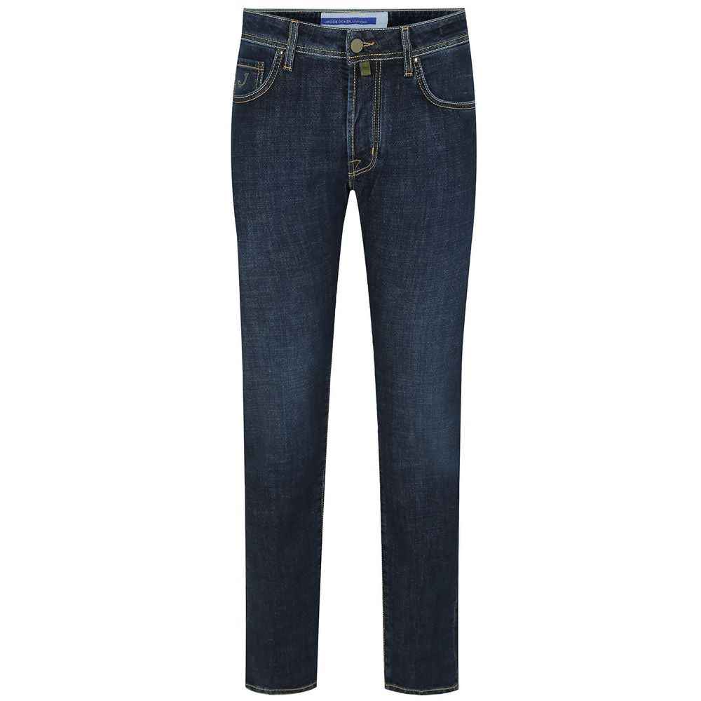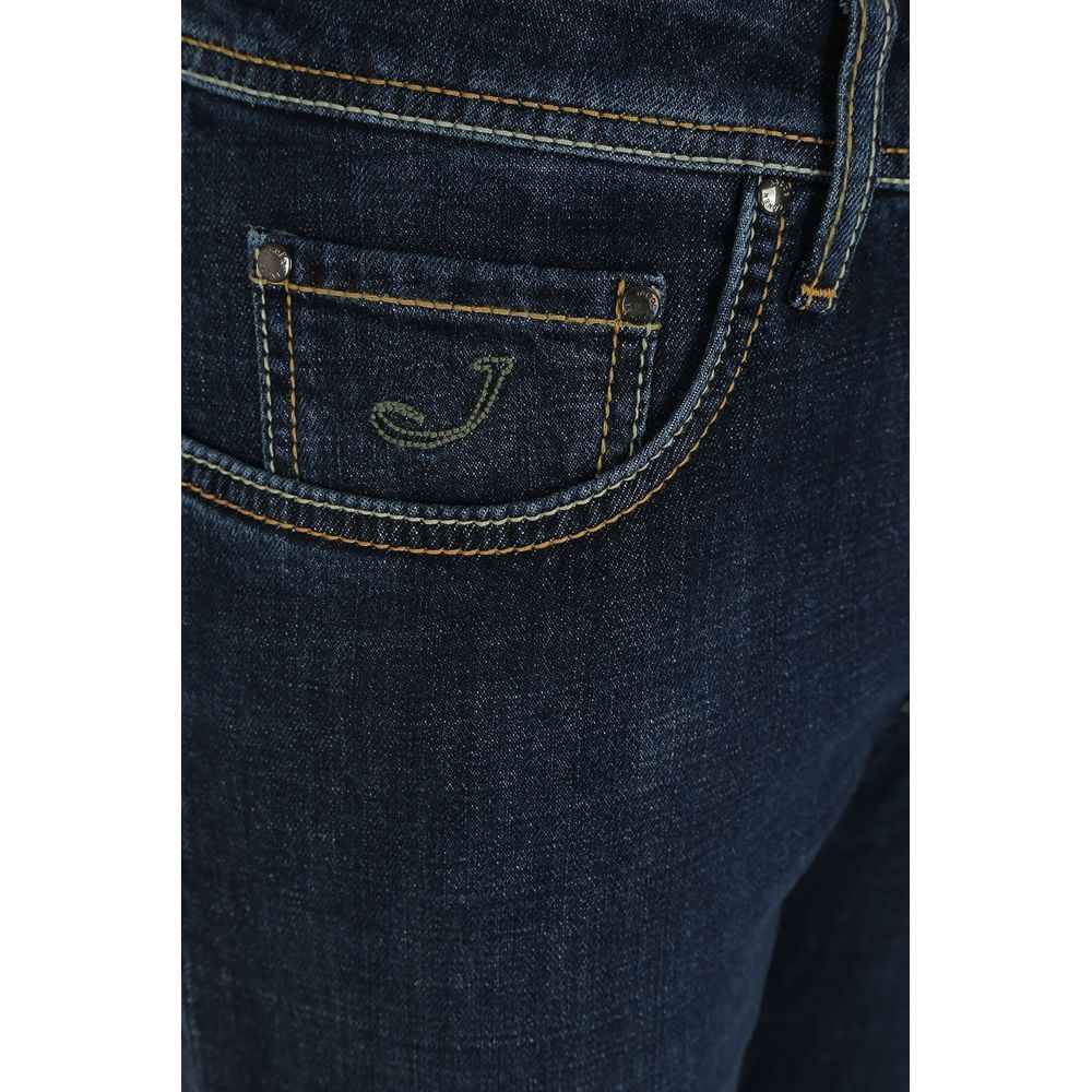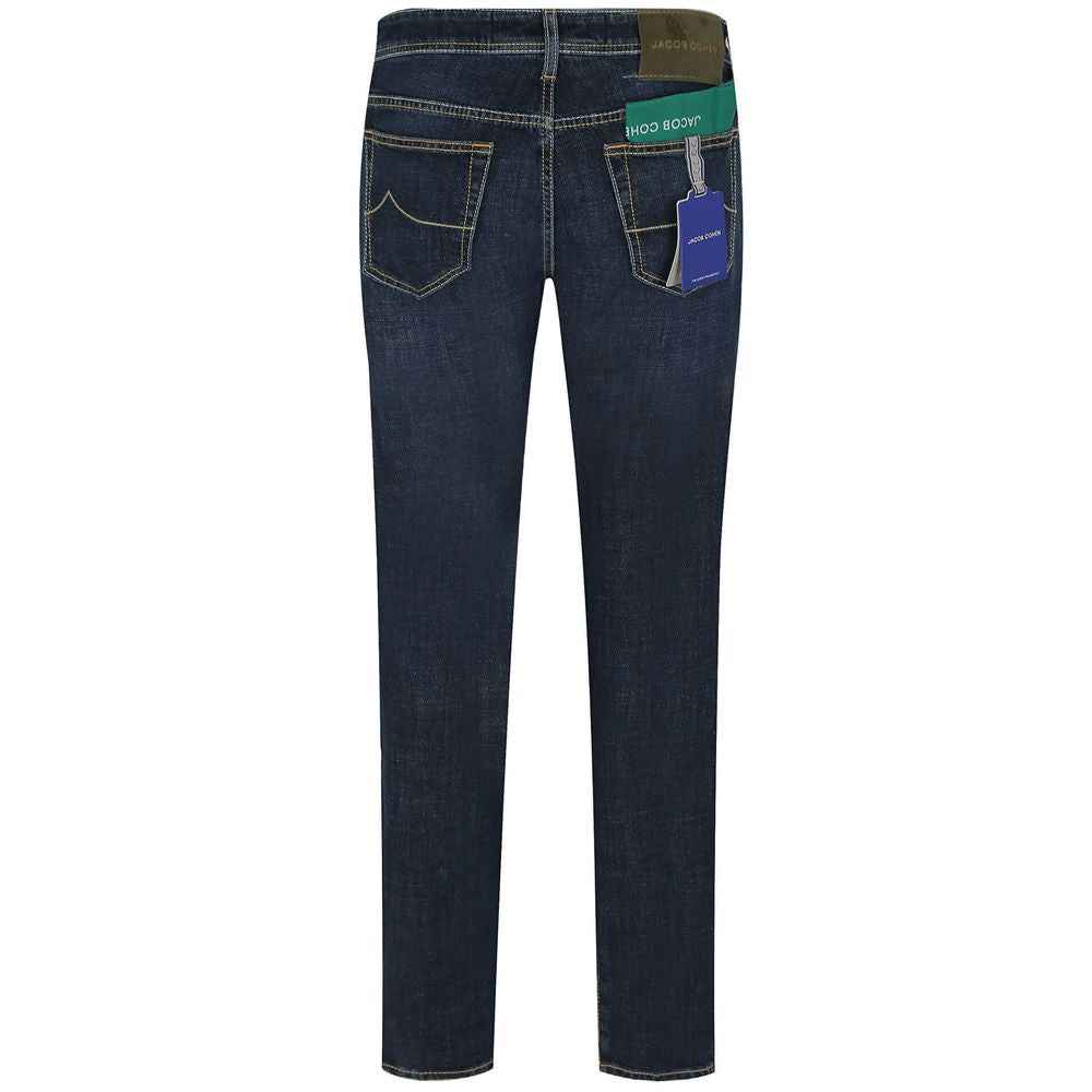 Discover the perfect blend of Italian craftsmanship and contemporary style with Jacob Cohen’s Bard regular slim fit jeans. These dark blue denims, crafted with a hint of stretch for comfort, boast a classic button closure and signature yellow stitching. The distinctive green pony patch adds an exclusive touch, asserting your fashion-forward taste with every wear.