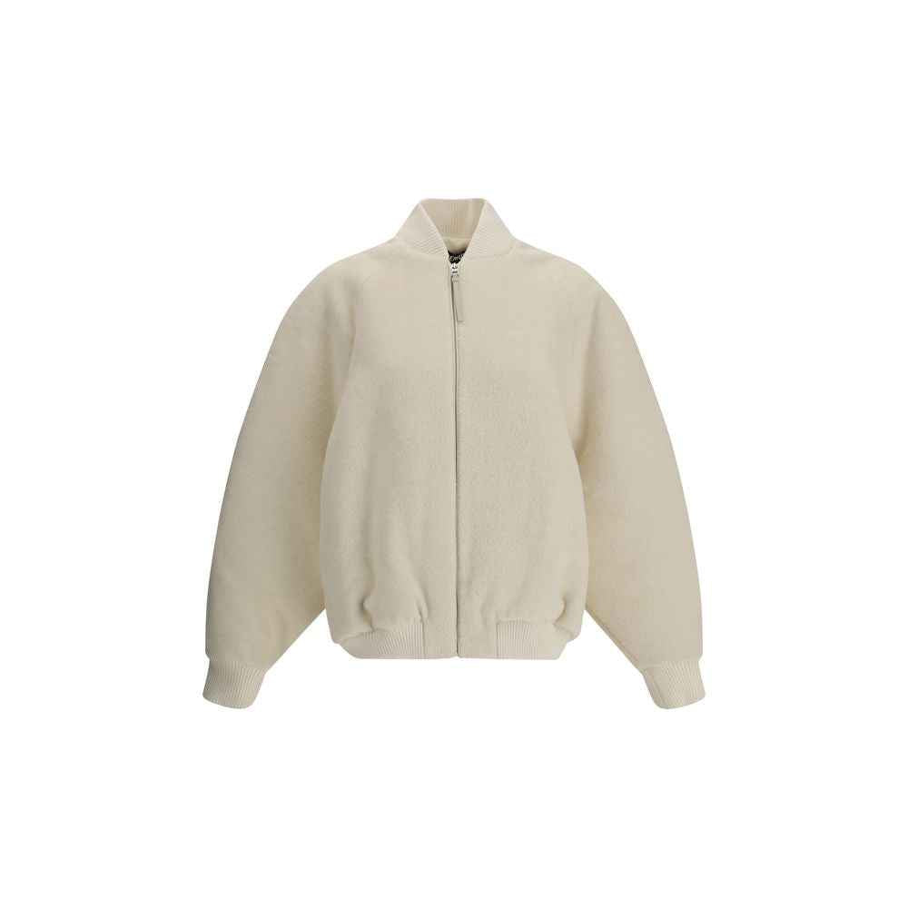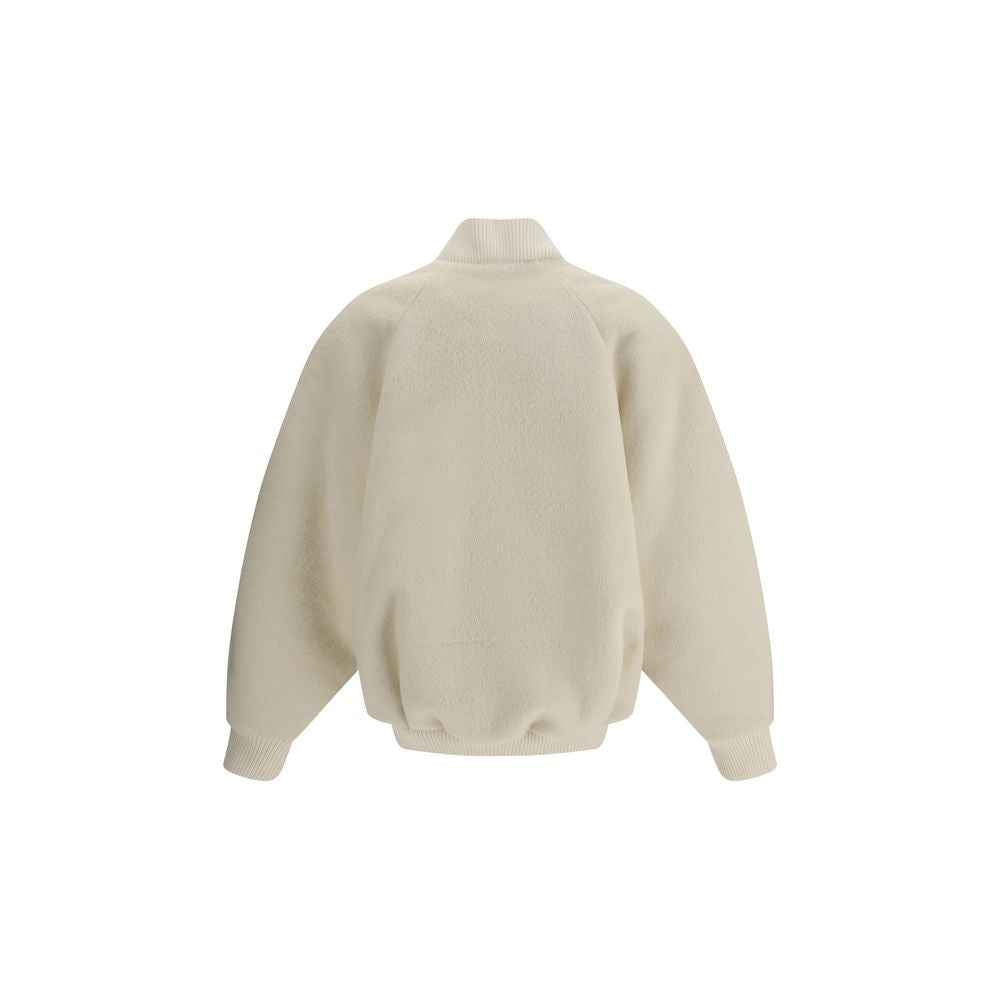 The Jacquemus Le Blouson Pilu jacket in white alpaca wool features a round neckline, front zip closure, and raglan long sleeves. Finished with ribbed wool edges, it combines comfort and sophisticated design in a contemporary piece