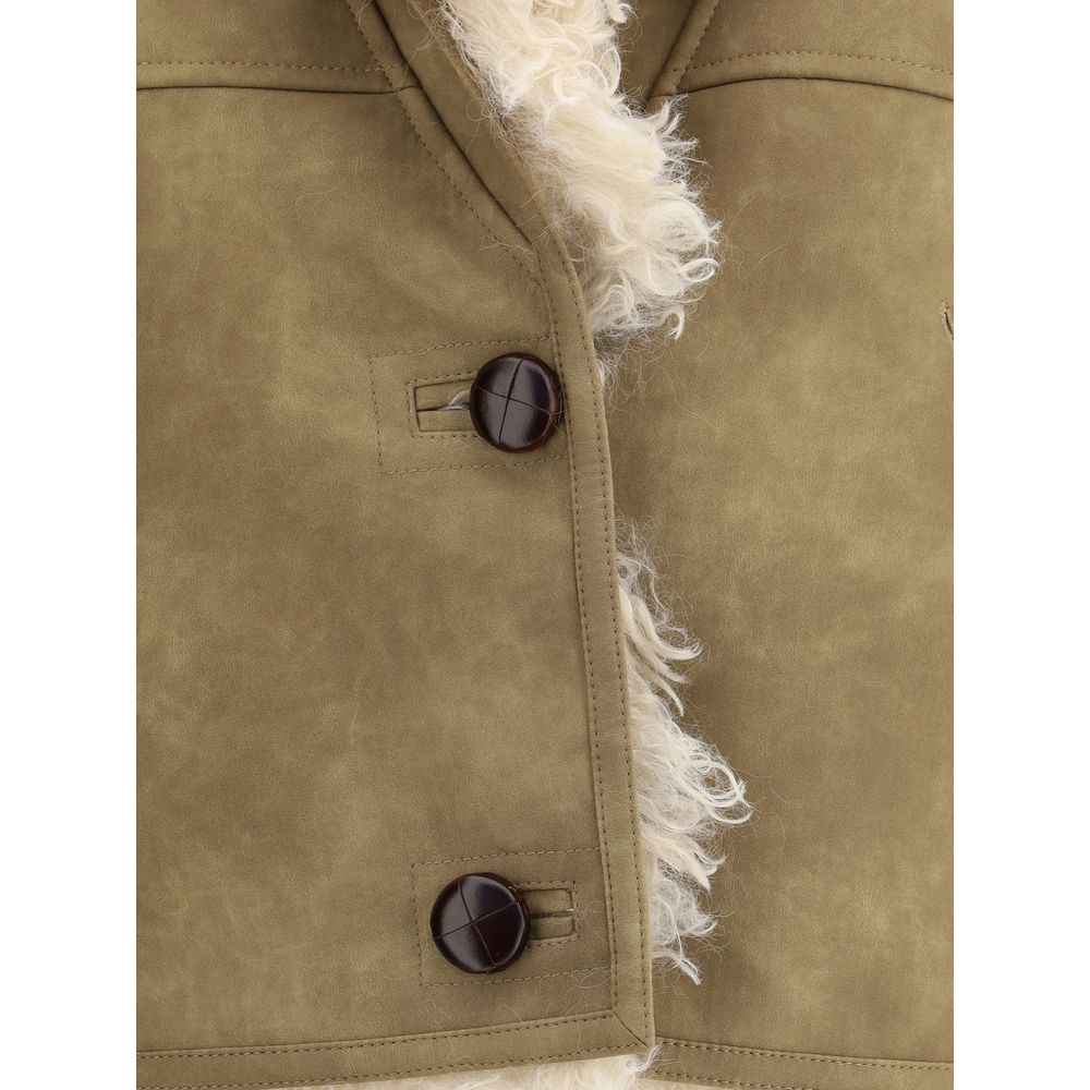 Marant Etoile’s Clara Gilet, made of shearling faux leather, is a refined and contemporary design. It features a shawl collar, front button closure, side welt pockets and a short cut that enhances the silhouette, perfect for adding a touch of style to seasonal looks.