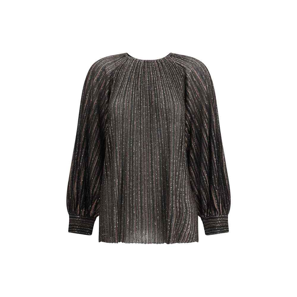 Missoni’s Striped sequined Blouse is a feminine and sophisticated piece, featuring a simple crew neck and balloon sleeves that give it volume and movement. The raw-cut hem adds a modern detail, while sequins embellish the striped pattern with a touch of refined flare.