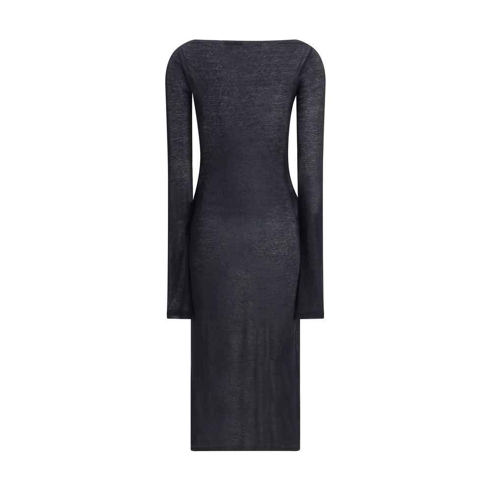 Miu Miu’s Long Jersey Dress is a piece that combines comfort and sophistication. Featuring an elegant boat neckline that enhances the neckline, this dress features long sleeves for a touch of class and versatility. The stitched logo on the front adds a distinctive and discreet detail, making the dress recognizable without sacrificing understatement. Perfect for casual occasions or casual-chic evenings, it is a versatile and sophisticated piece in every woman’s wardrobe.