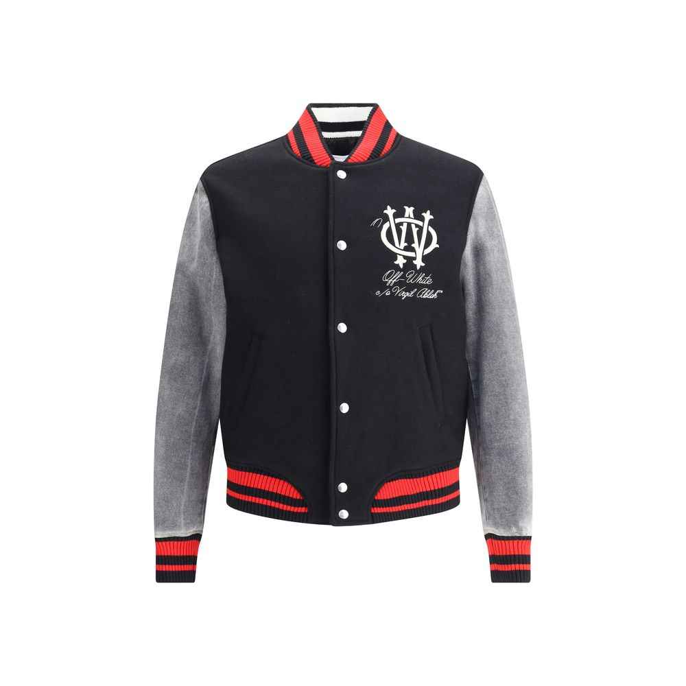 The Gothic OW Wool Varsity Jacket by Off-White redefines collegiate style with a modern urban twist. Featuring a ribbed collar, snap-button front closure, and side welt pockets, the jacket stands out for its contrast faux-denim sleeves paired with a wool body. Ribbed cuffs and hem ensure comfort and structure, while the embroidered logo at the front anchors the brand’s identity. At the back, gothic embroidered lettering elevates the piece into a bold statement, capturing Off-White’s signature blend of streetwear edge and refined design.