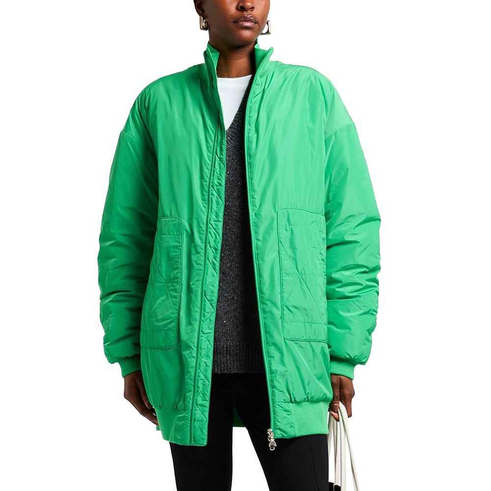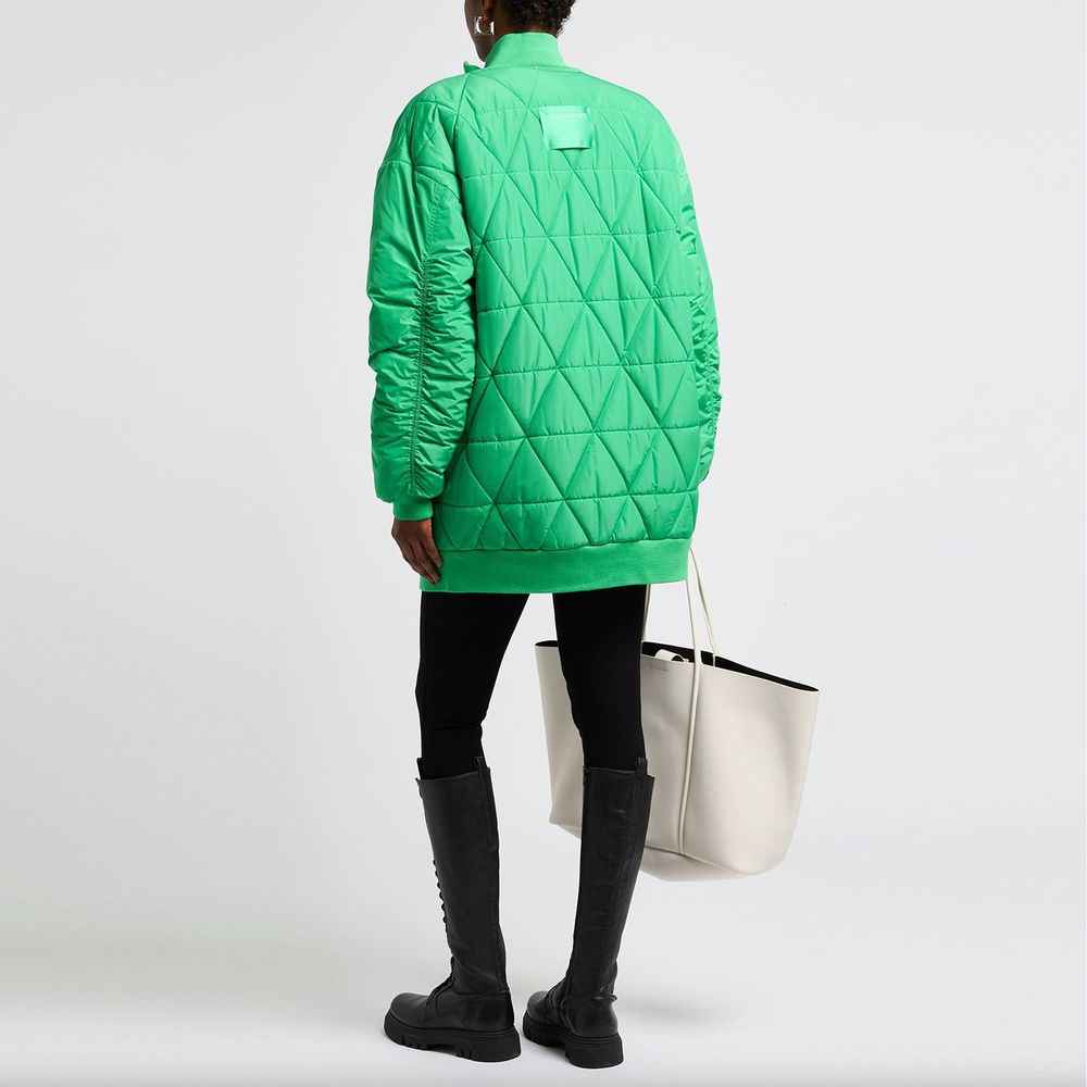 Patrizia Pepe long green bomber jacket with quilted back, pockets with snap buttons, and logo zip pull