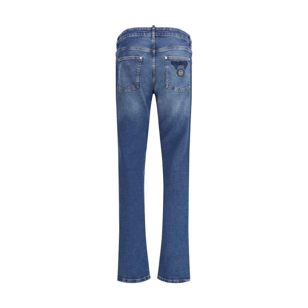 The Super Straight Cut Jeans by Philipp Plein reimagine the classic five-pocket design with the brand’s bold attitude. Crafted from distressed denim, they feature a stitched back label and a metal button-adjusted waistband. The Super Straight fit delivers a clean, contemporary silhouette that perfectly embodies Plein’s signature blend of edge and sophistication.