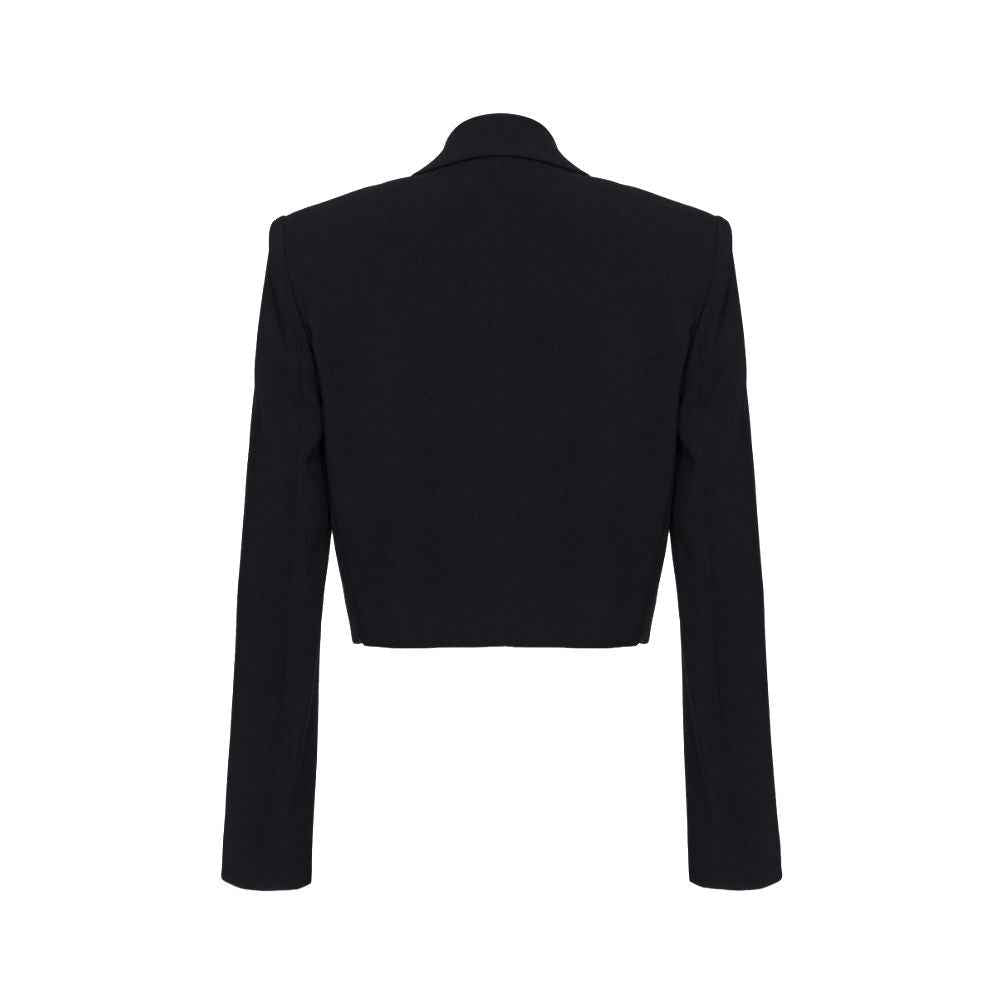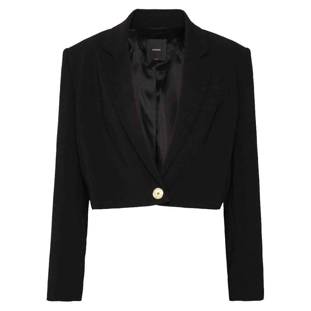 Dare to make a statement with this stunning PINKO short jacket, the epitome of chic sophistication. Crafted from a superb blend of polyester and elastane, this piece ensures both comfort and elegance with a stretch crepe fabric that contours gracefully to the body. Shimmering gold buttons add a touch of luxury, while the solitary chest pocket introduces an element of classic tailoring. Fully lined for seamless wear, this Italian-made jacket is a timeless addition to your wardrobe, perfect for those looking to exude confidence and style.