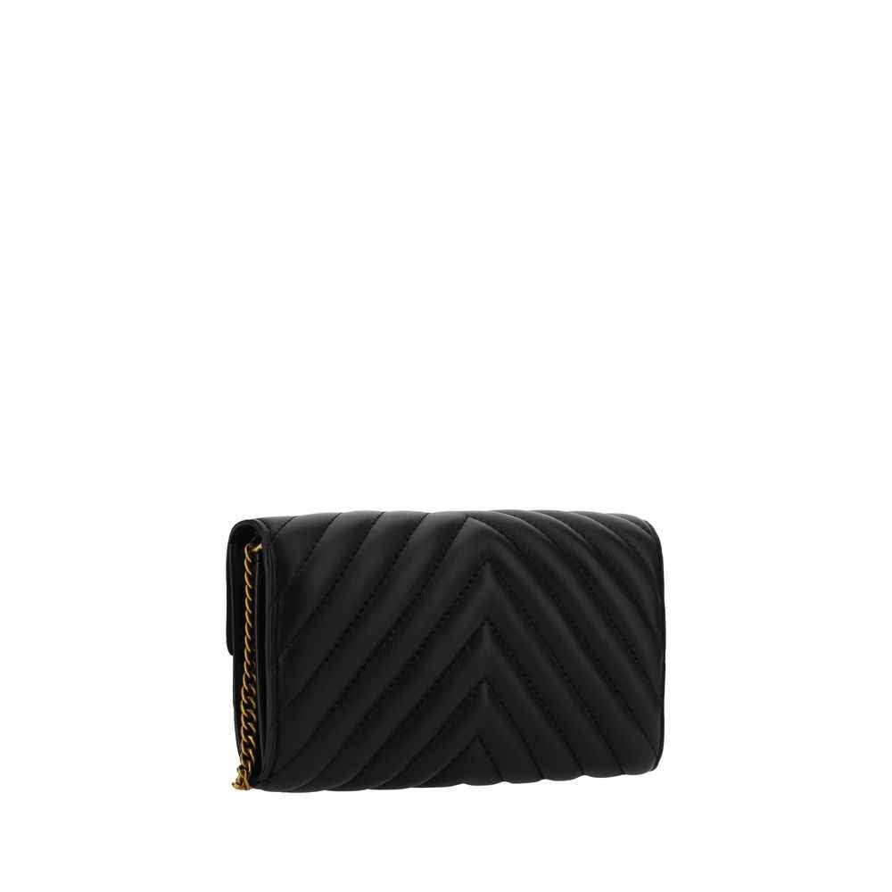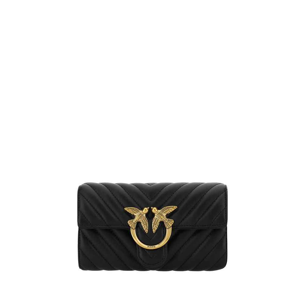Calfskin Love One Shoulder Wallet by Pinko, front magnetic flap closure, iconic gold-plated and embossed Love Birds logo on front, quilted and padded design, double interior compartment, chain shoulder strap, card slot inside, bill compartment, zippered coin pocket, iconic tone-on-tone embroidered brand monogram on back.