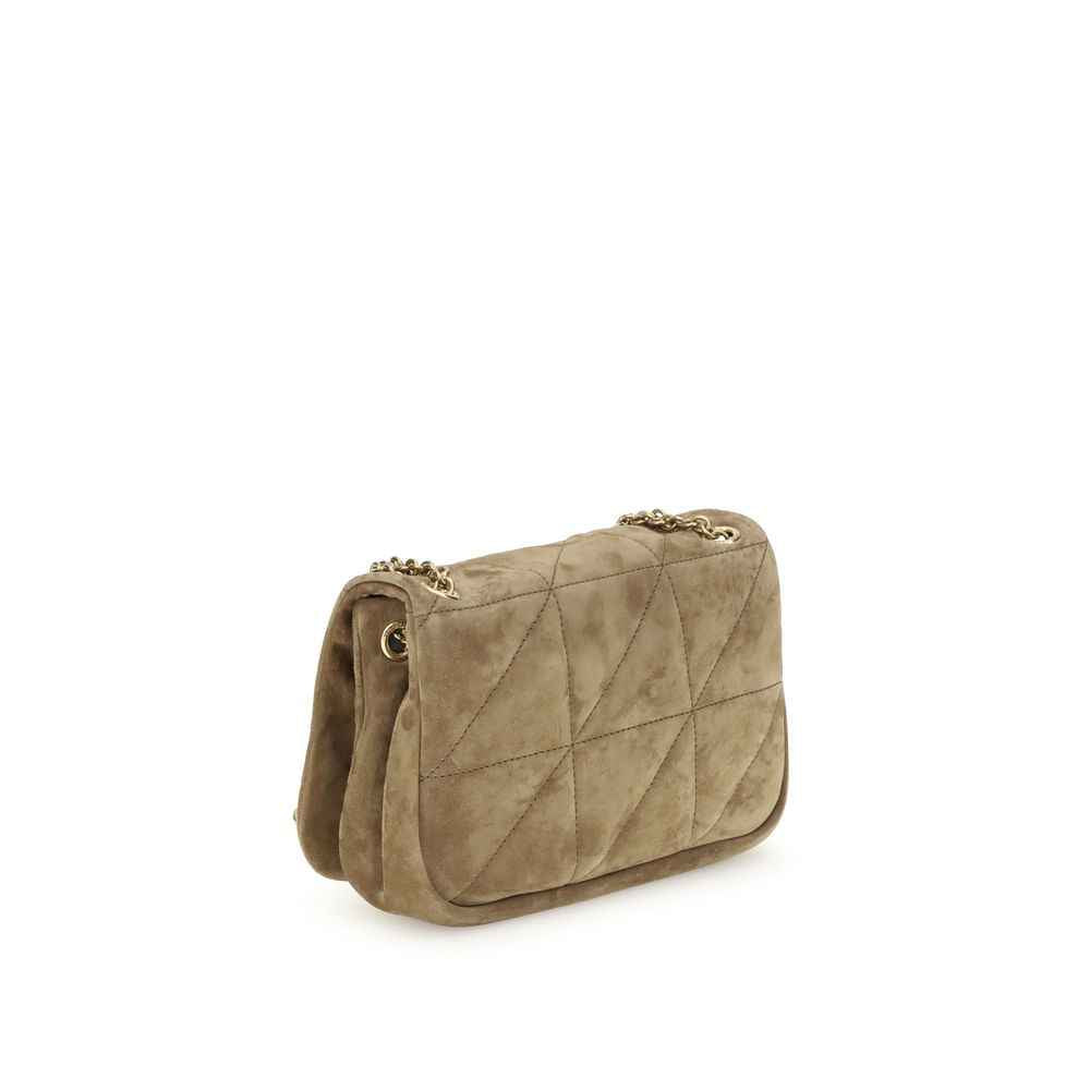 The Jamie Shoulder Bag by Saint Laurent is made of suede and features a sleek and sophisticated design. It has a flat top handle and a chain shoulder strap with a leather insert for added comfort. The flap closure on the front is embellished with the iconic YSL detail, a distinctive symbol of the brand. The quilted design lends a touch of sophistication, while the interior is organized with a single compartment.