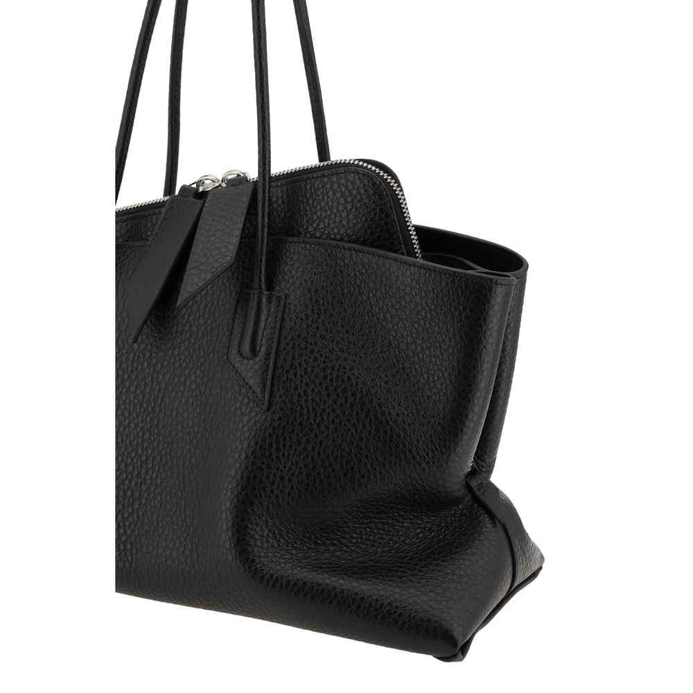 Leather La Passeggiata Shoulder Bag by The Attico, two flat tubular handles at top, double-slider zipper top closure, geometric sliders, iconic brand signature press-stamped on contrasting front, asymmetrical geometric bag.