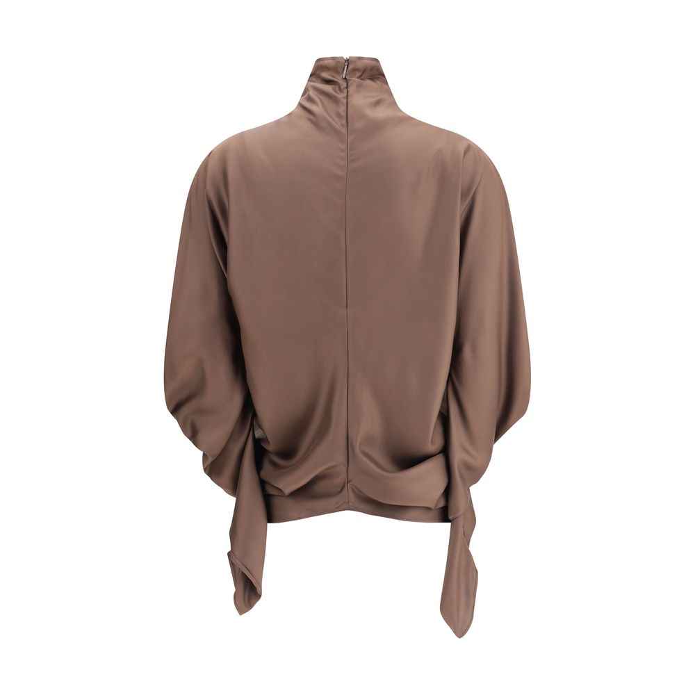 The draped Miles Silk Blouse by The Row embodies essential and sophisticated elegance. The high neck is paired with a back zip fastening, while the long sleeves and asymmetrical hem give the piece a fluid and refined character, true to the brand’s minimalist vision.