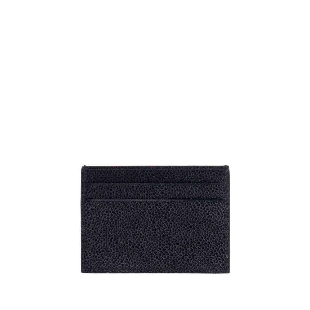 Leather Card Holder by Thom Browne, card slots on front and back, iconic striped tag on front, printed logo on bottom.