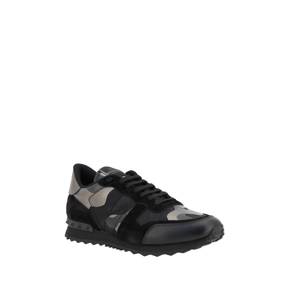 Leather sneakers by Valentino Garavani, lace-up front closure, suede detailing, camouflage pattern, textured knurled sole, contrasting logo insole.